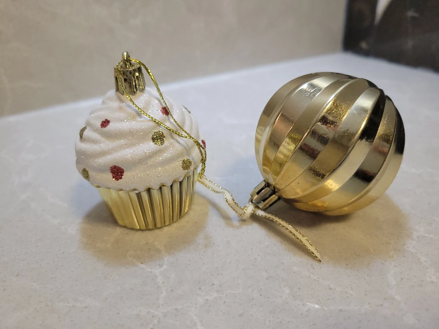 Two festive Christmas ornaments Includes a white cupcake ornament with red and gold glittery dots and a shiny gold ball ornament with ridged detailing. Both with attached strings and are ready to hang!