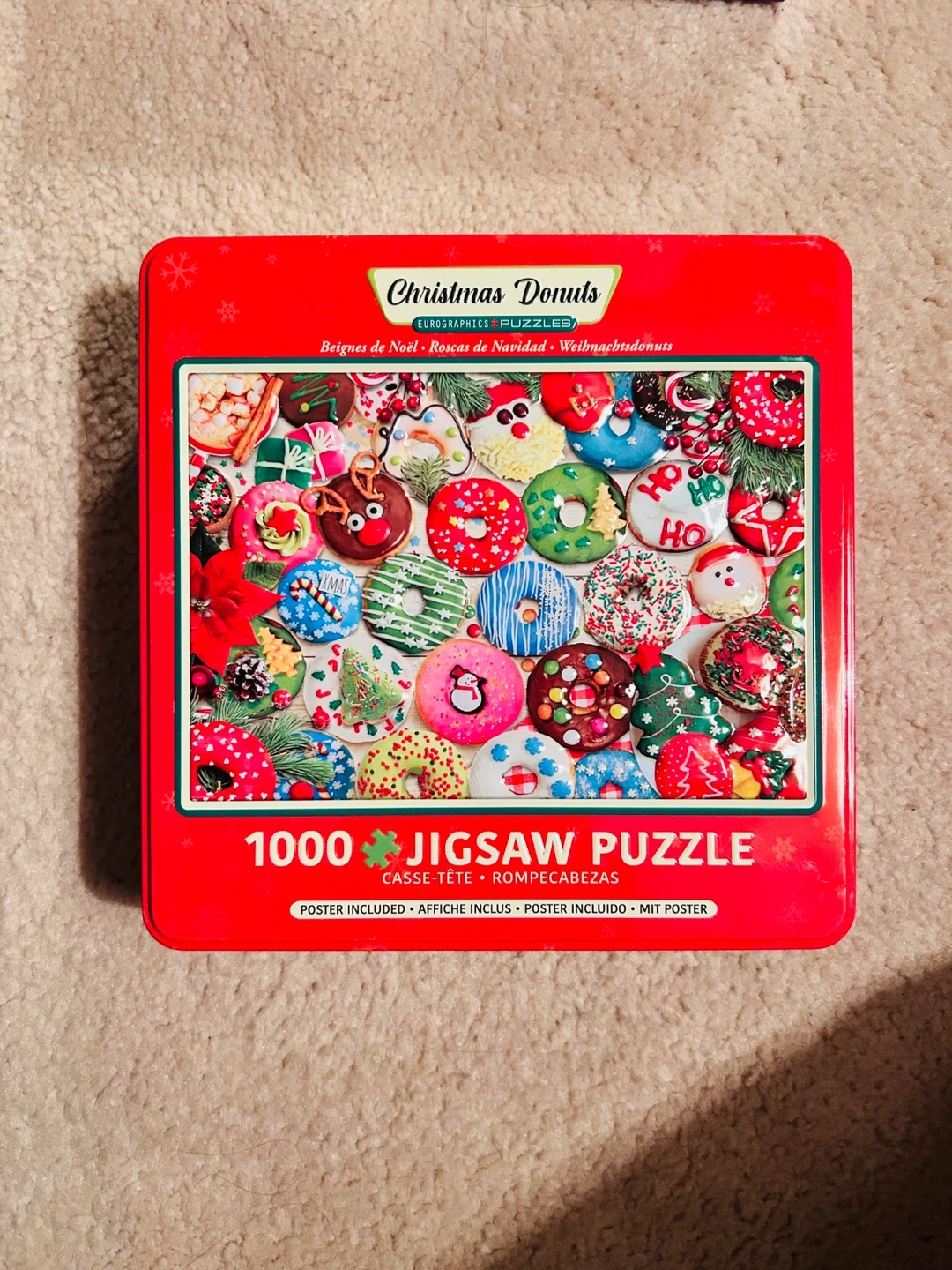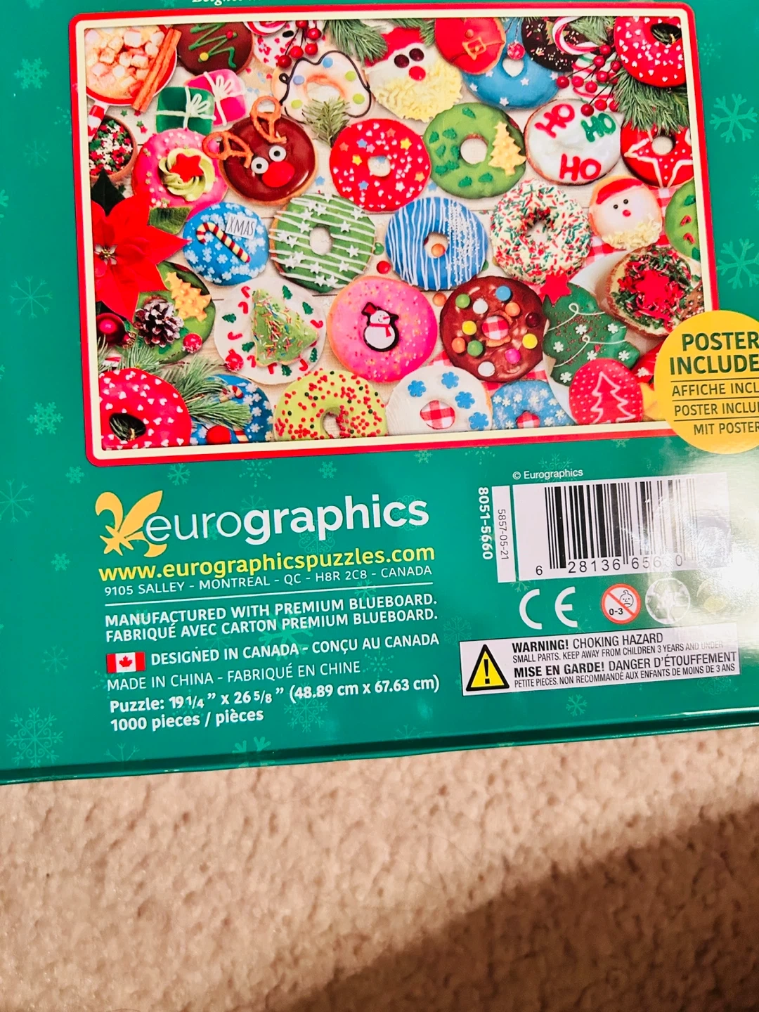 This Eurographics jigsaw puzzle features a festive donut design. It's 1000 pieces and includes a poster. The puzzle measures 19 1/4 inches by 26 5/8 inches.