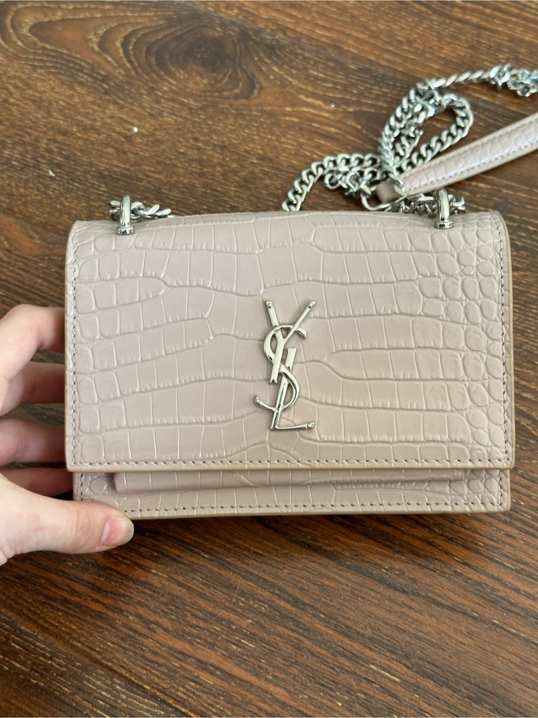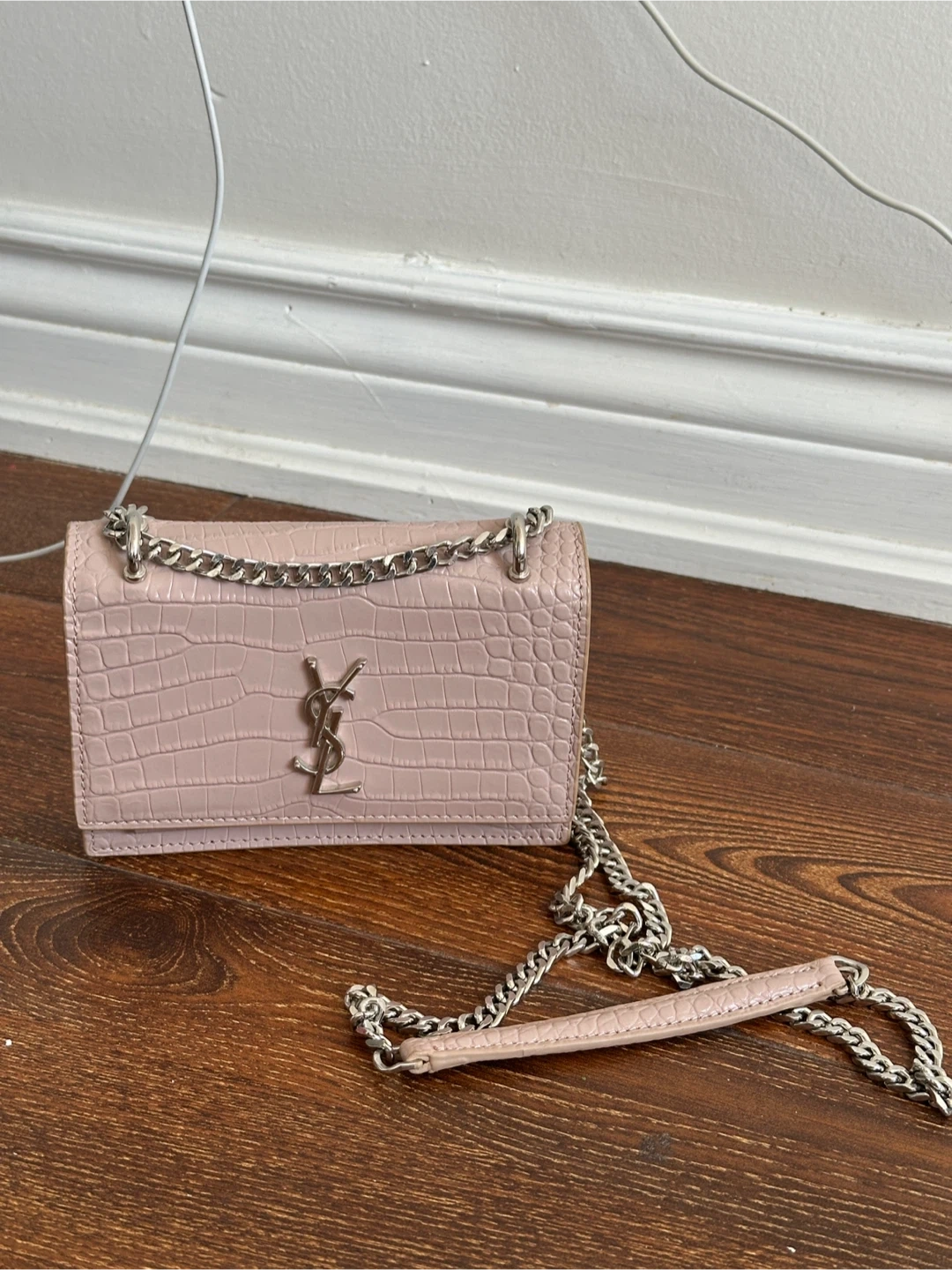 This Saint Laurent Monogram wallet is crafted from pink, crocodile-embossed leather. It features the signature YSL logo and a silver-tone chain strap. Multiple card slots inside.