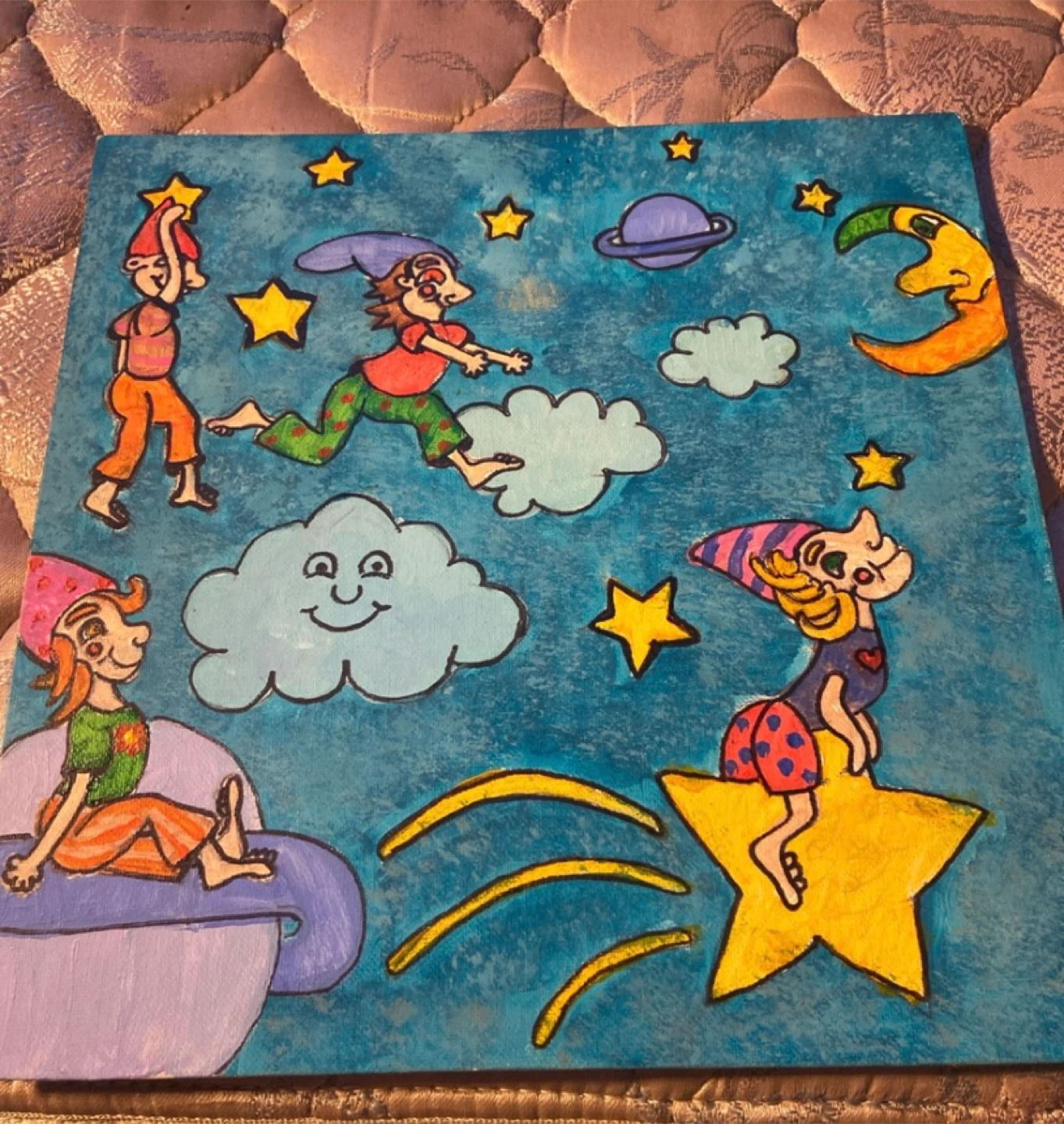 This is a handmade art piece depicting whimsical characters in a starry, cloudy night sky. It features playful figures with colourful outfits and dreamlike elements like a moon and planets. The artwork is on a textured blue background, perfect for adding a touch of fantasy to any room.