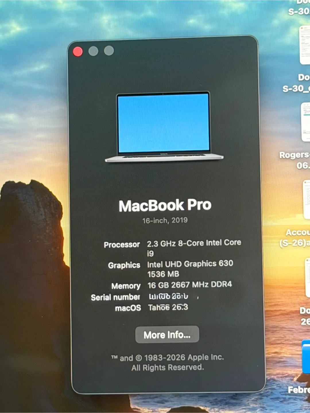 This is a 2019 MacBook Pro in excellent condition Space Gray with a 16-inch Retina display. It's powered by a 2.3 GHz 8-Core Intel Core i9 processor and has 16 GB of 2667 MHz DDR4 RAM. The storage is 1 TB Macintosh HD.