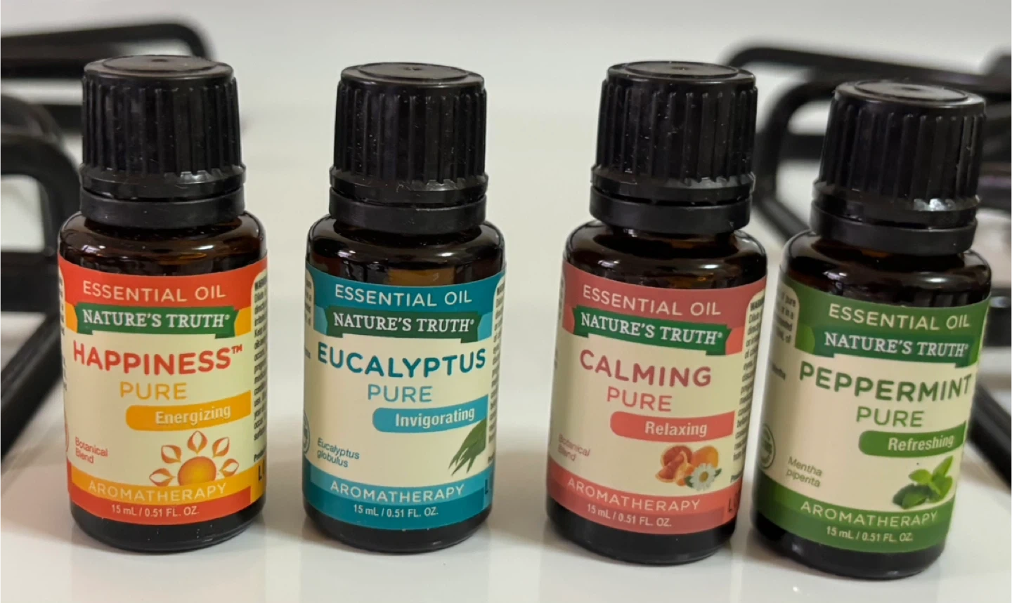 This set includes four Nature's Truth essential oils: Happiness, Eucalyptus, Calming, and Peppermint. Each bottle contains 15 ml / 0.51 fl. oz. of pure essential oil. They're designed for aromatherapy use.