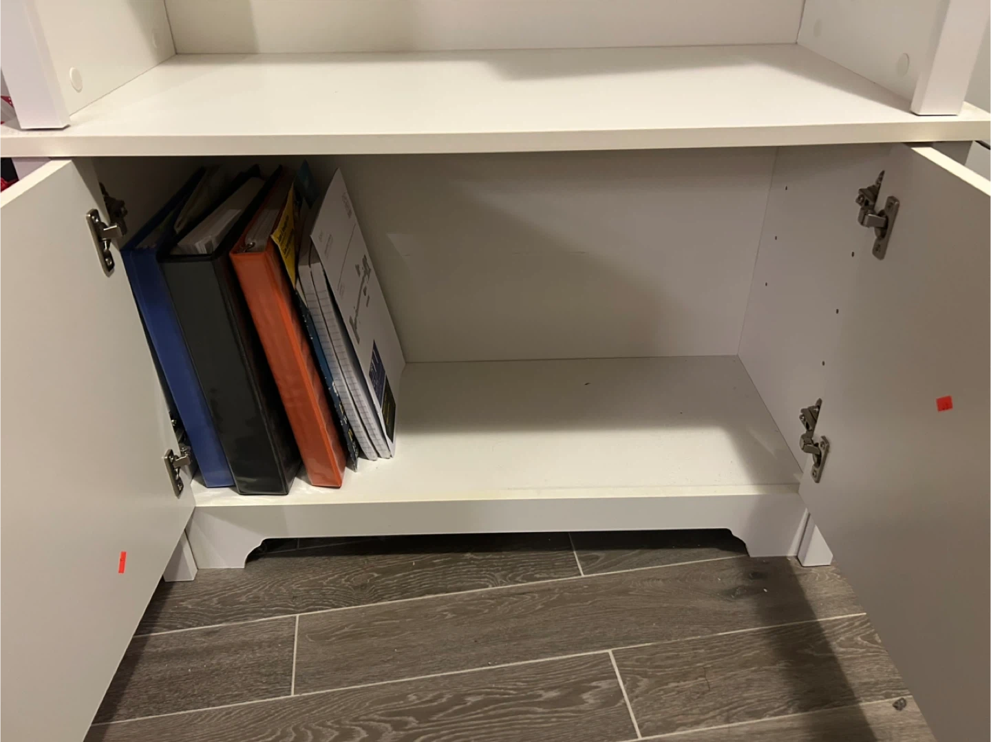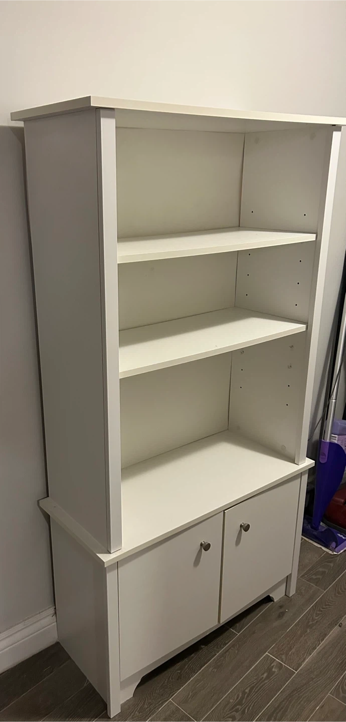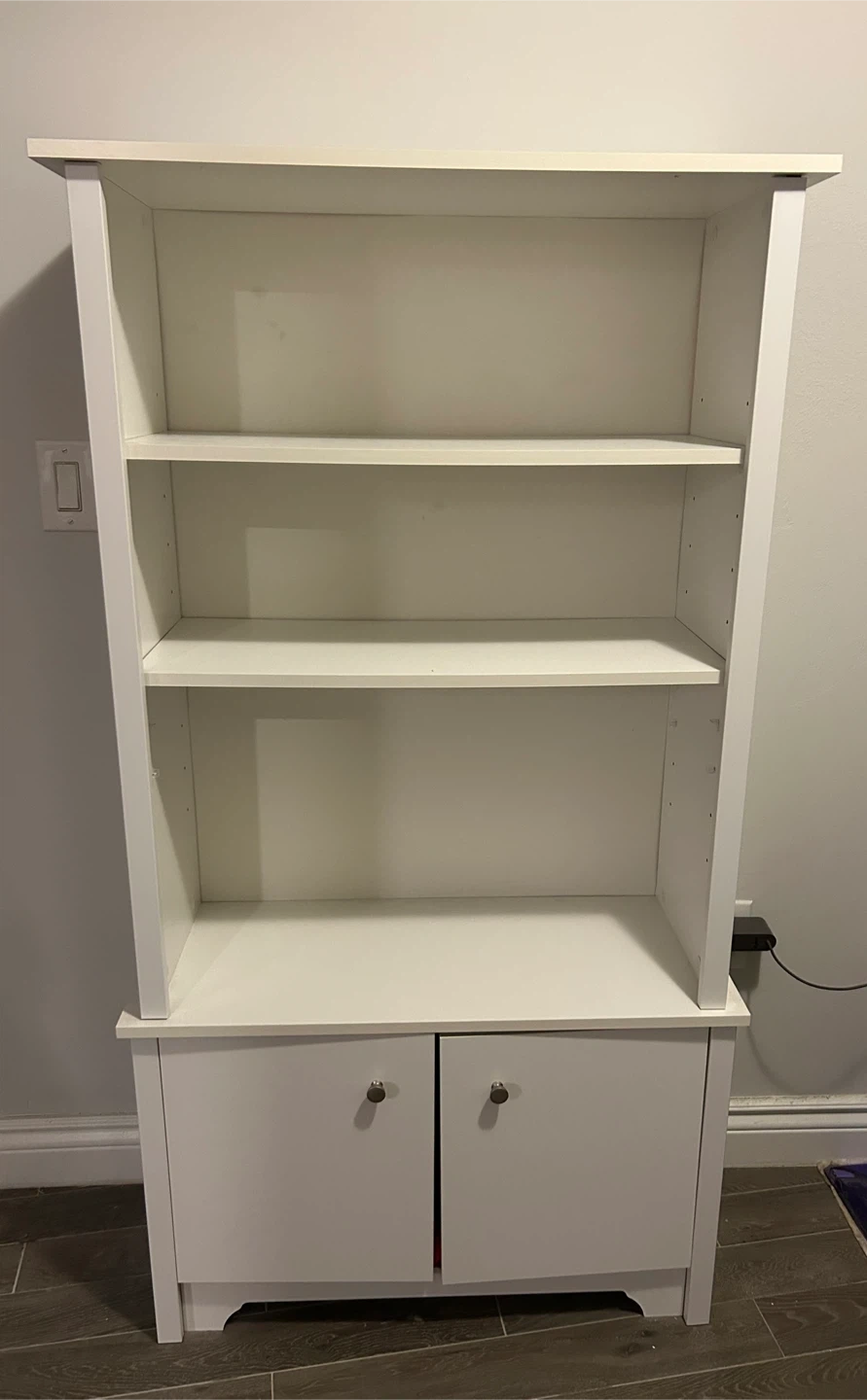 White bookcase with three shelves and a cabinet with two doors at the bottom. It's made of a durable material and perfect for storing books or displaying decor. The cabinet offers concealed storage space.