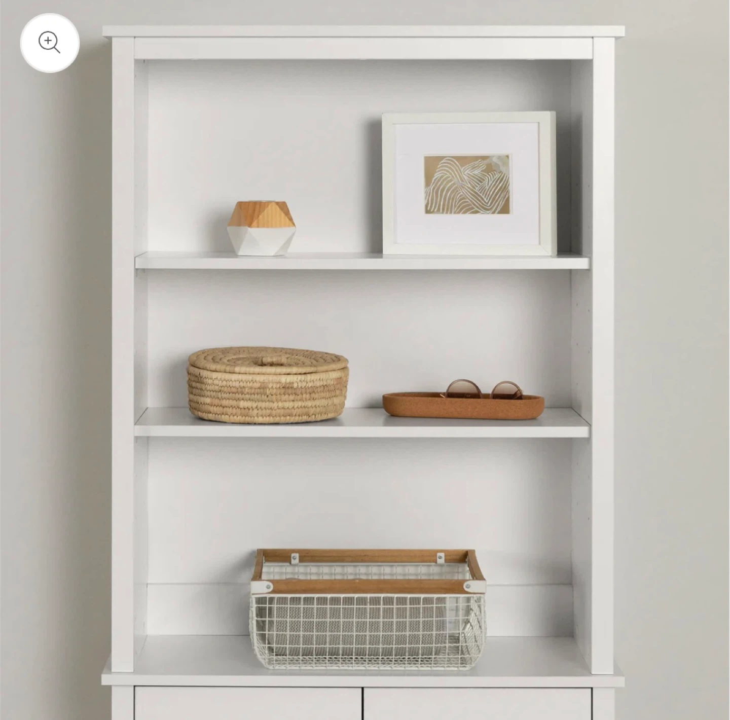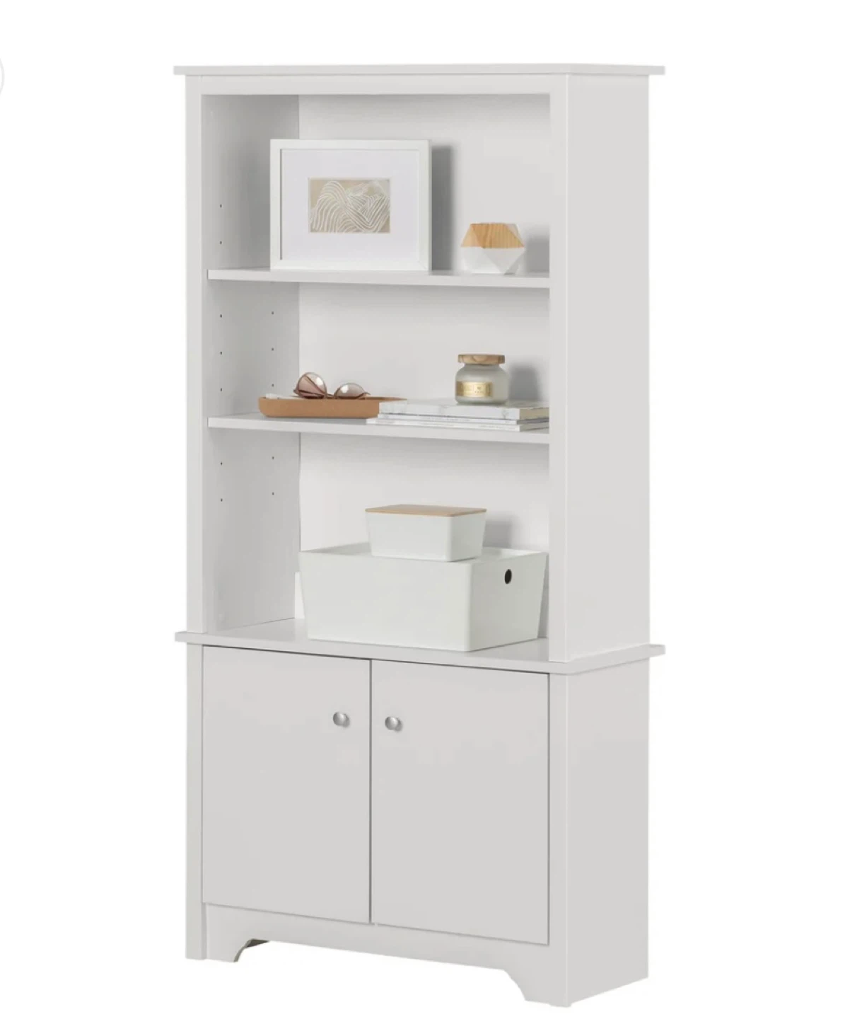 White bookcase with three shelves and a cabinet with two doors at the bottom. It's made of a durable material and perfect for storing books or displaying decor. The cabinet offers concealed storage space.
