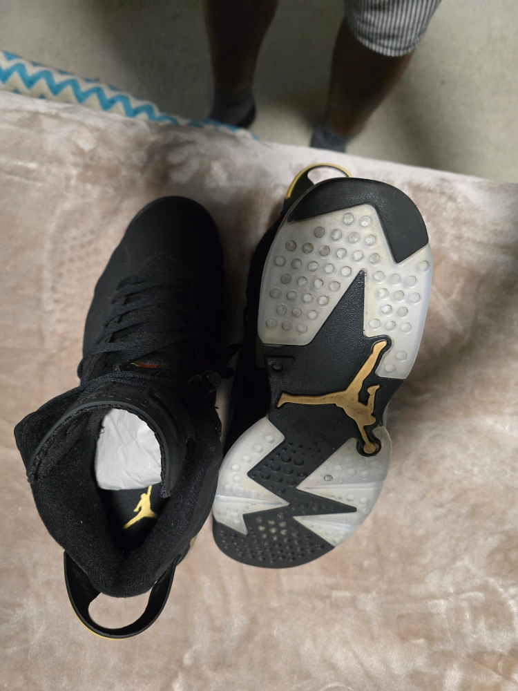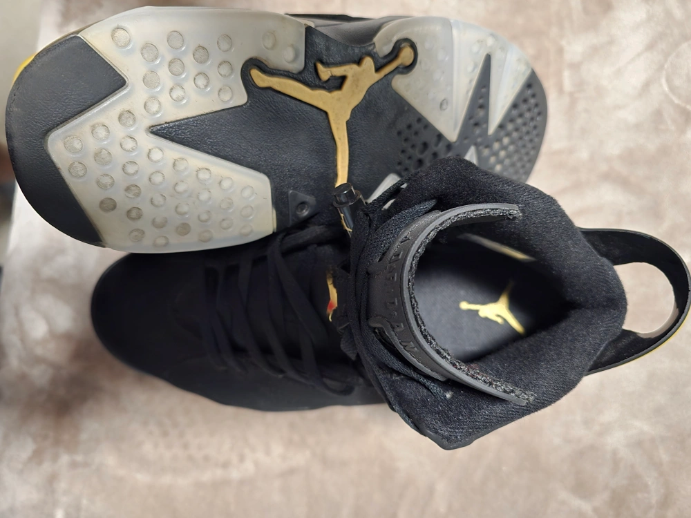 Selling a pair of Jordan 6 Retro DMP sneakers in black and gold. They feature the number 23 on the heel and the Jumpman logo. Great for basketball or casual wear! size 9.5US. used only once going to church