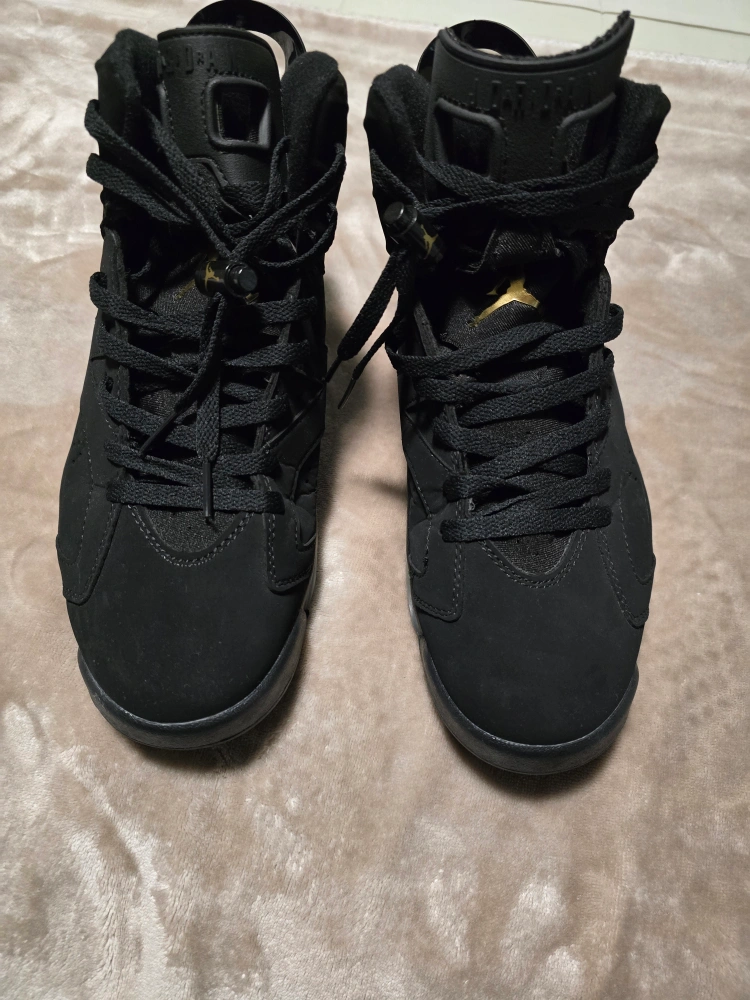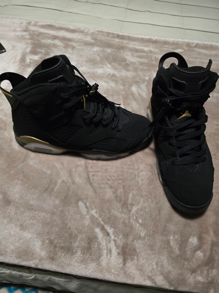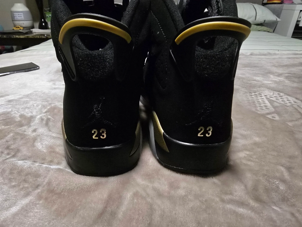 Selling a pair of Jordan 6 Retro DMP sneakers in black and gold. They feature the number 23 on the heel and the Jumpman logo. Great for basketball or casual wear! size 9.5US. used only once going to church