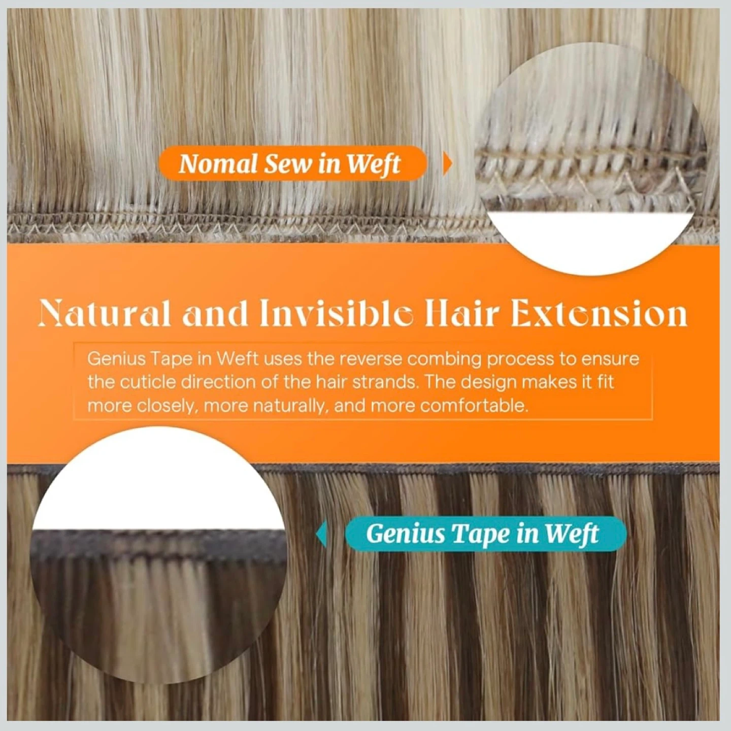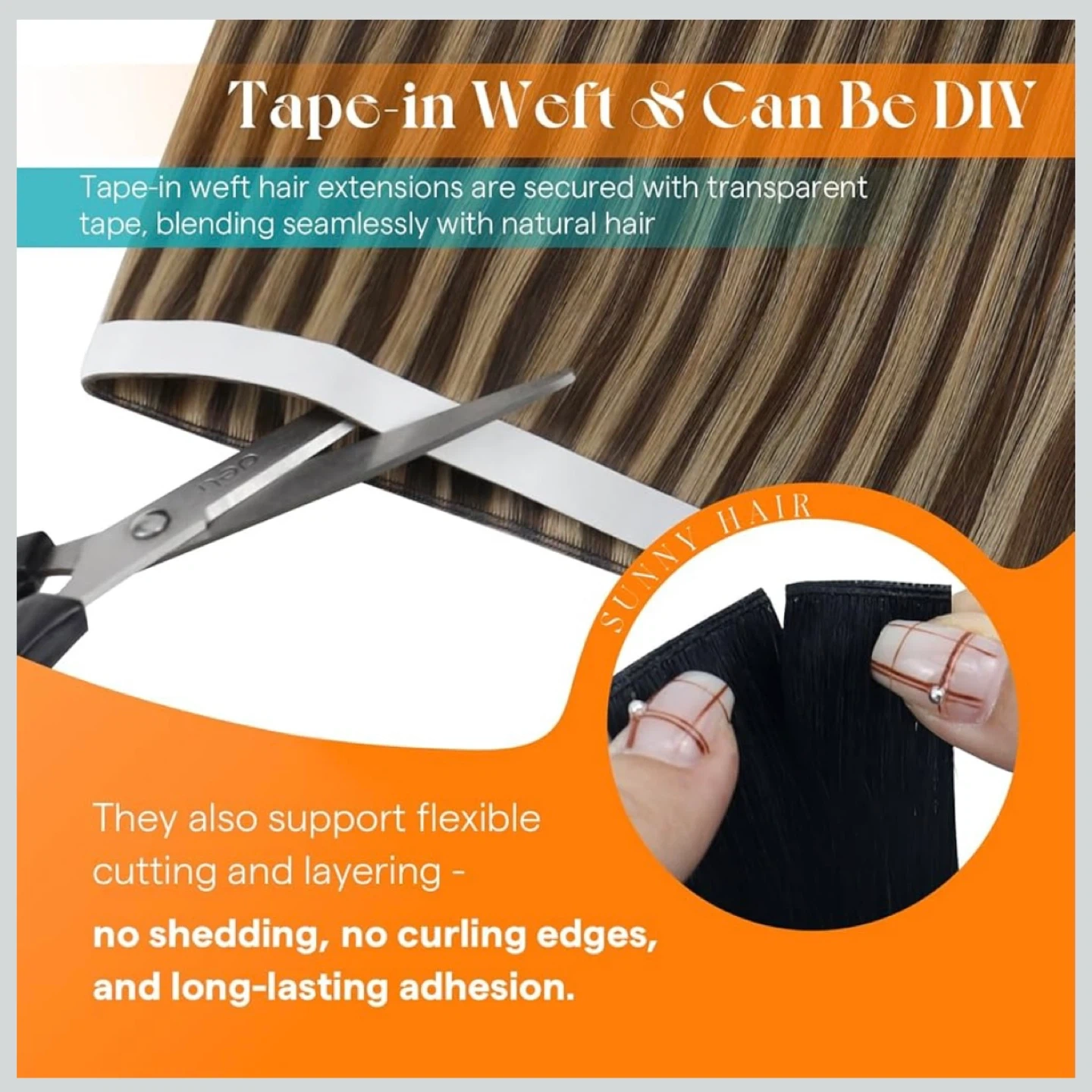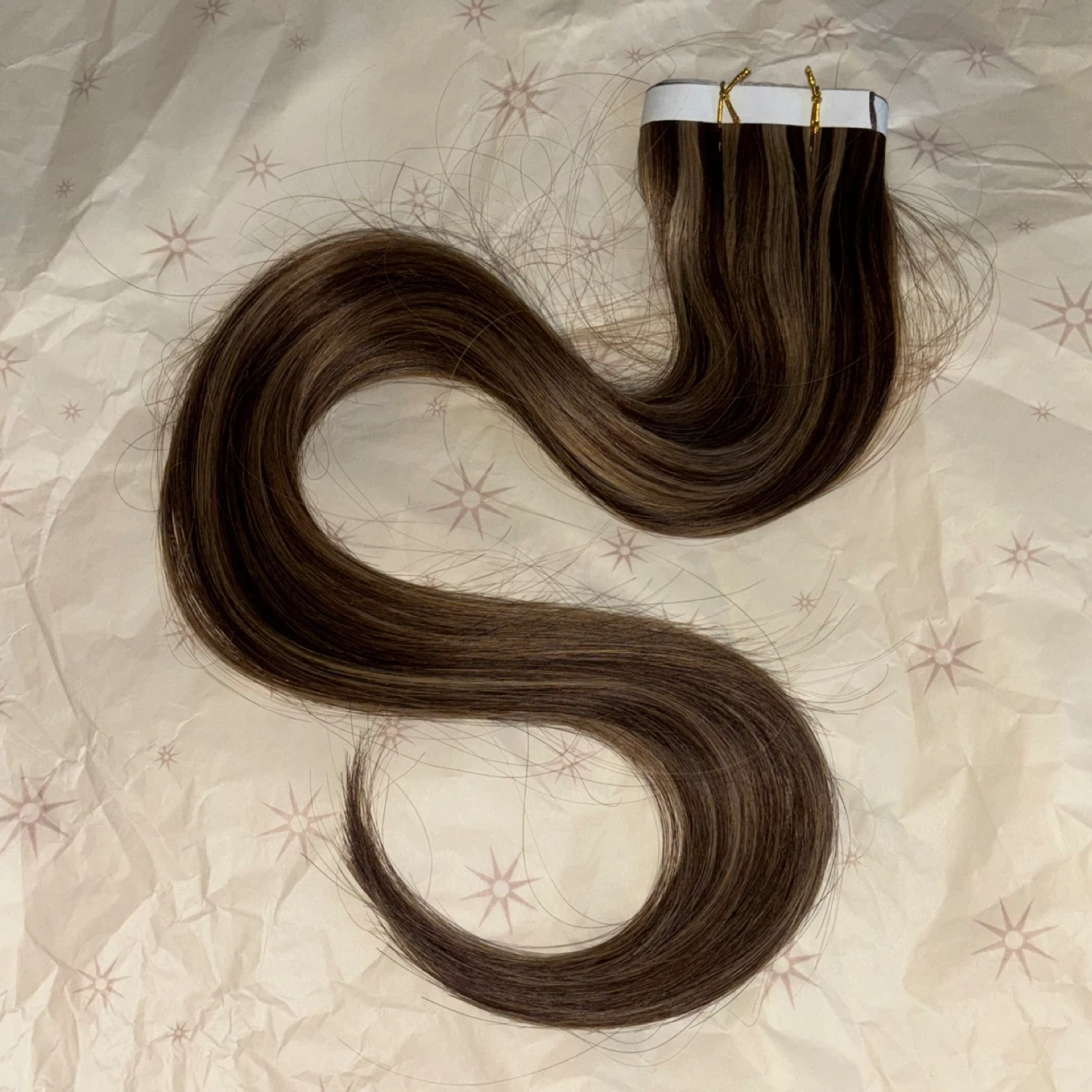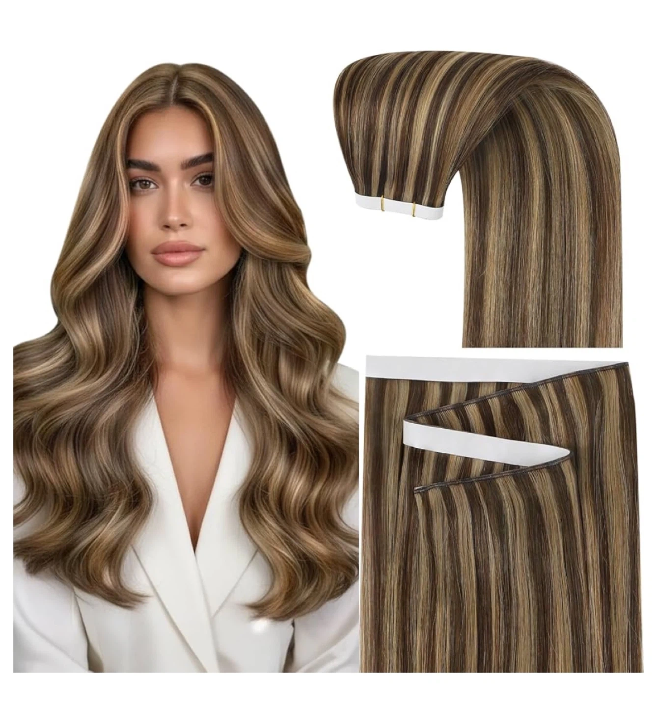 24 inch tape in weft human hair extensions medium brown highlight caramel brown. Includes adhesive strips making them reusable.