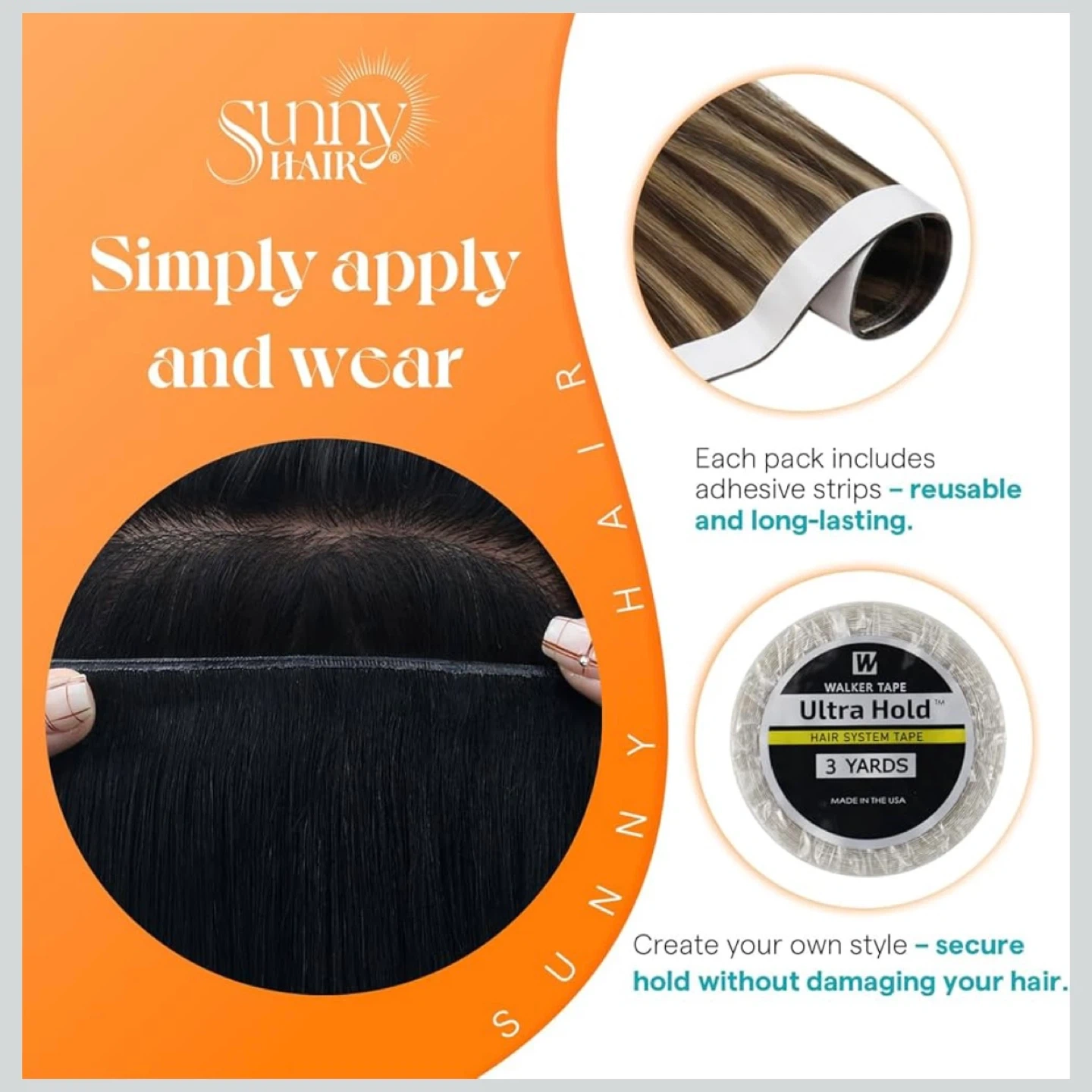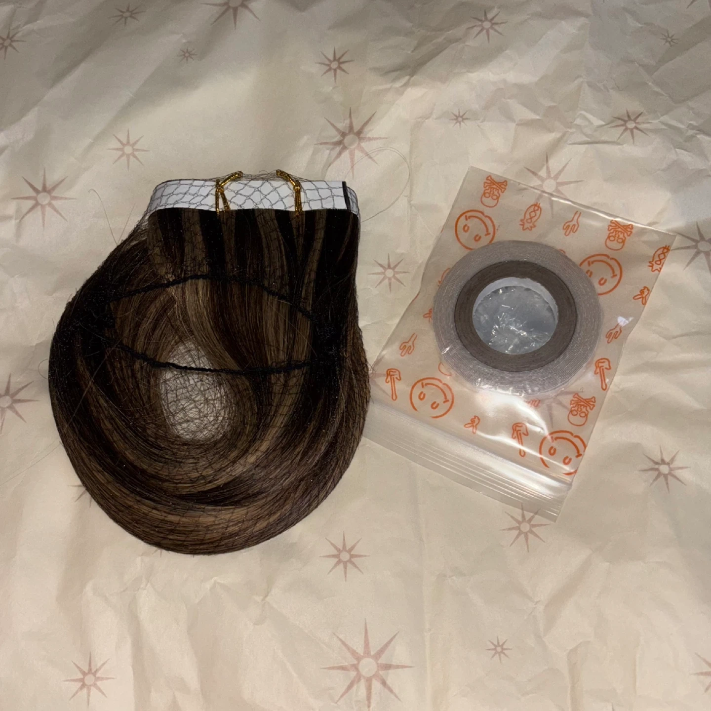24 inch tape in weft human hair extensions medium brown highlight caramel brown. Includes adhesive strips making them reusable.