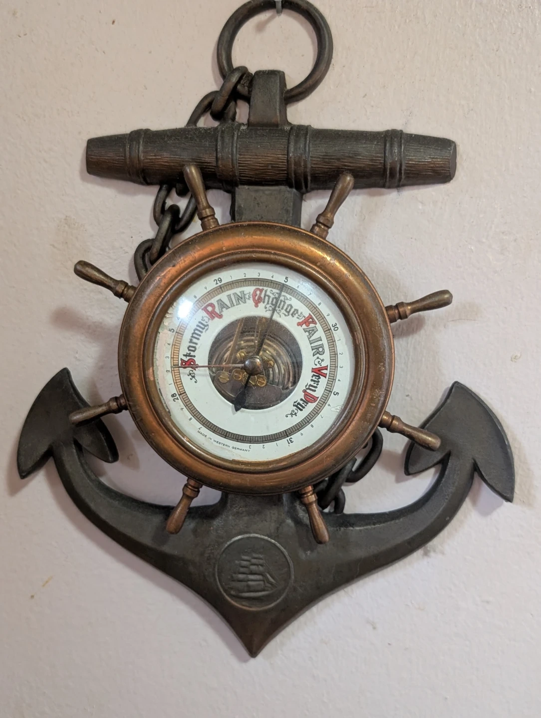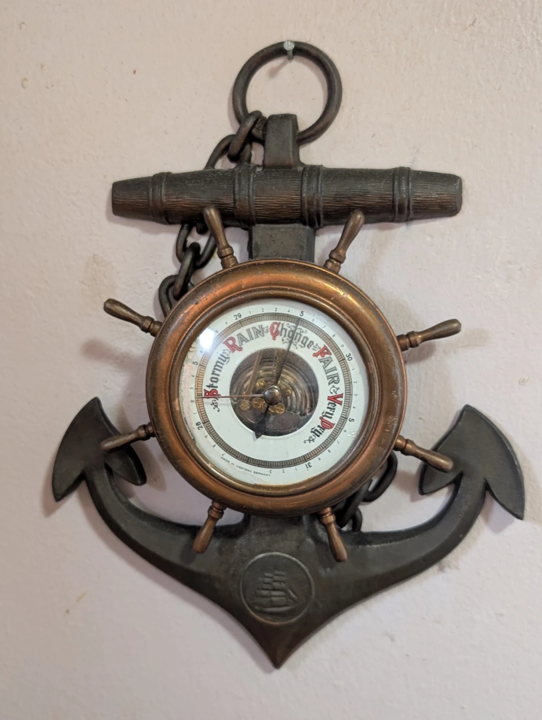 Check out this unique vintage nautical barometer! It's a wall hanging with an anchor and ship's wheel design. The barometer face reads "Stormy, Rain, Change, Fair, Very Dry". It's a cool piece of decor for anyone who loves nautical themes