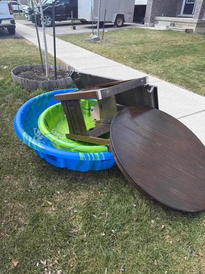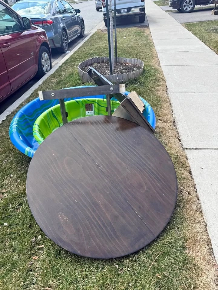 Clearing out some items! Everything is completely free and currently sitting on the curb. Expandable Dining Table: Dark wood finish. It is used and not in mint condition, but still fully functional and sturdy. Great for a small space or a DIY project. 4 Matching Chairs: These are included! Please note they are not in great condition—they will likely need a screw or two in the bottom legs to steady them up, but they are yours if you want them. 2 Plastic Kiddie Pools: One is in good shape; the other has a small hole that can be easily plugged. Please message me for the address if you are interested in coming to pick them up. You will need a vehicle capable of hauling these away! Pick up in West Brant.