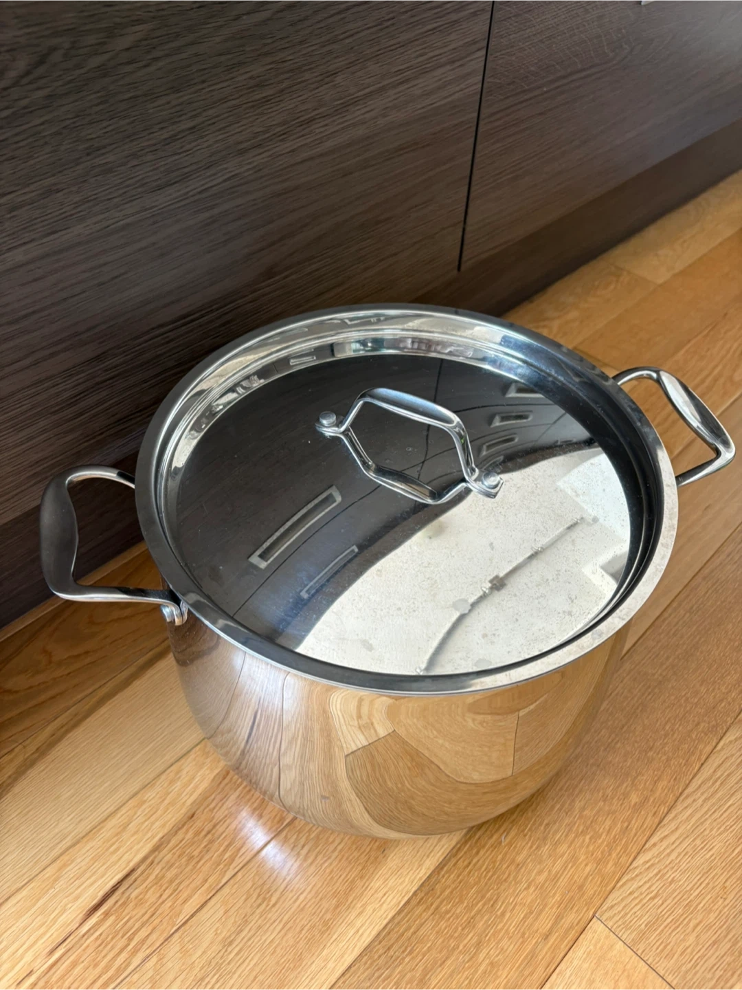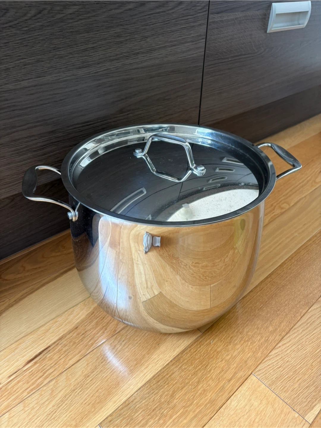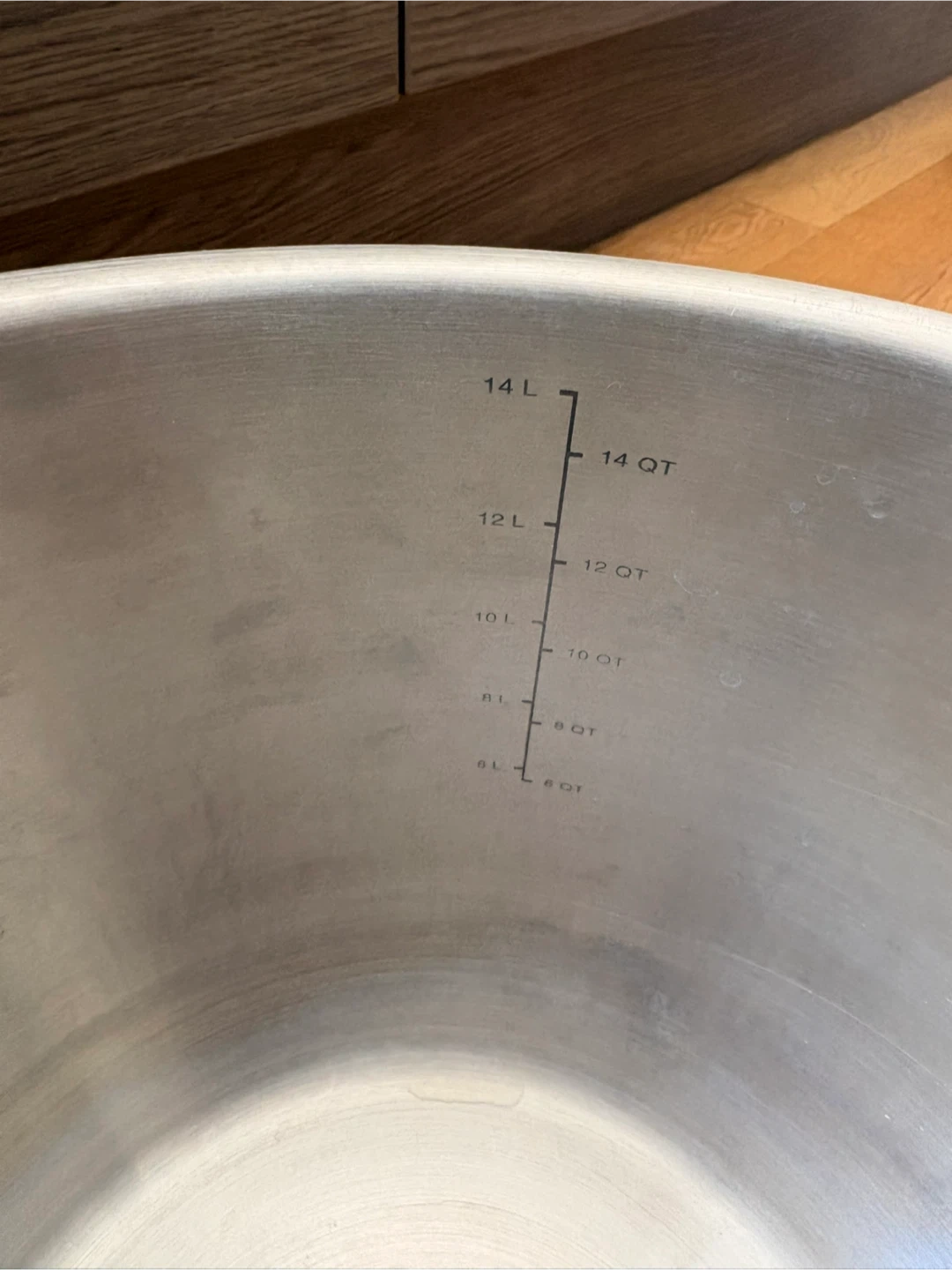 A large stainless steel stock pot with measurement markings inside (15.1L)