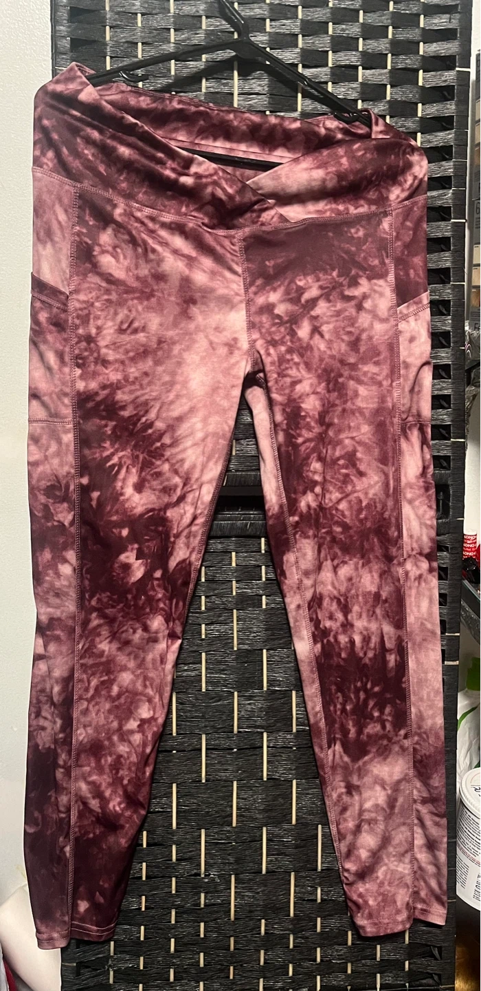 These athletic leggings feature a stylish tie-dye pattern in shades of maroon and pink. They include convenient side pockets and a flattering V-waist design. Made from a comfortable, stretchy fabric for active wear.