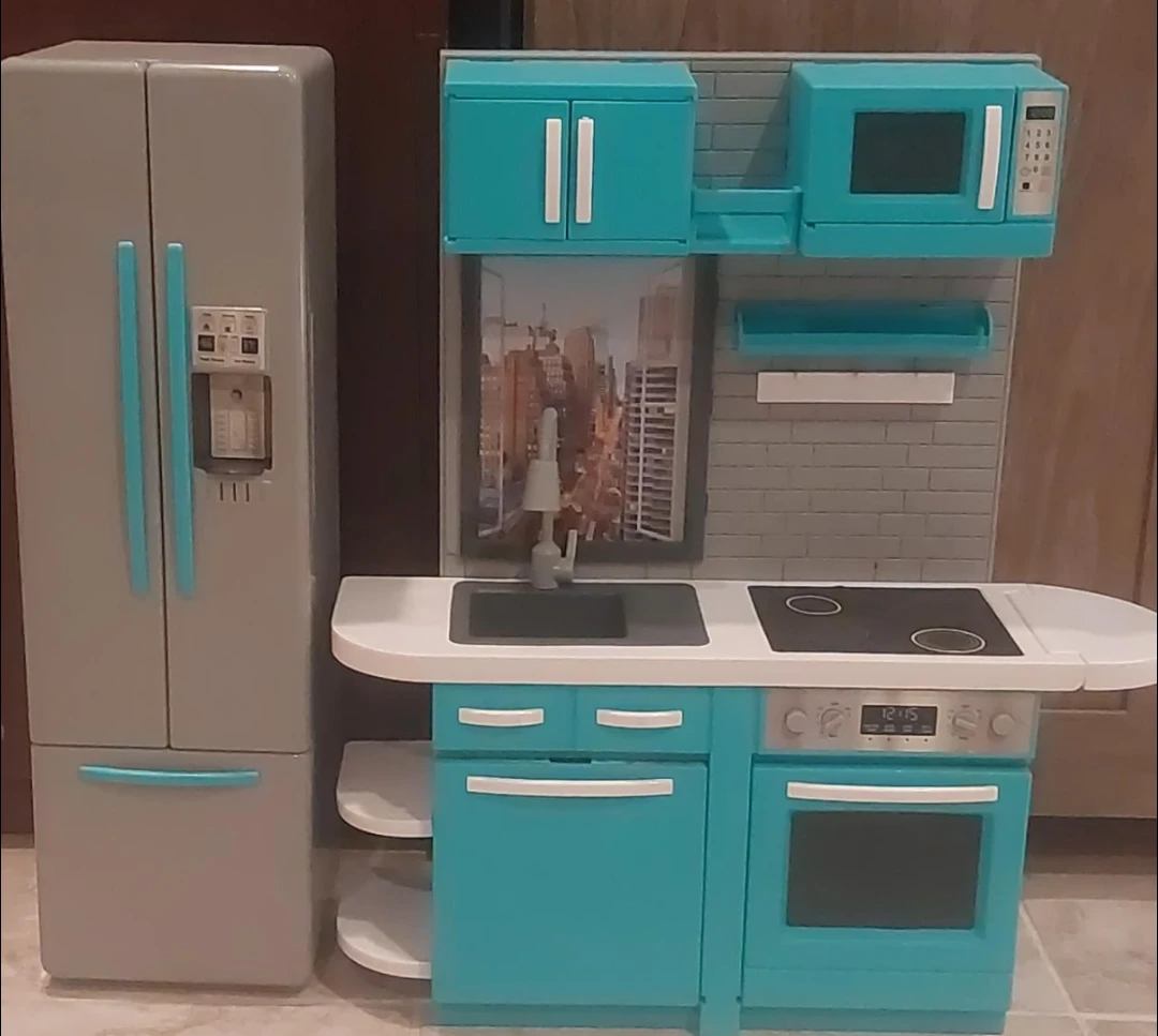 A cute toy kitchen set in turquoise and grey! Perfect for your little one's imaginative play. It includes a fridge, oven, and other kitchen accessories to spark creativity and fun