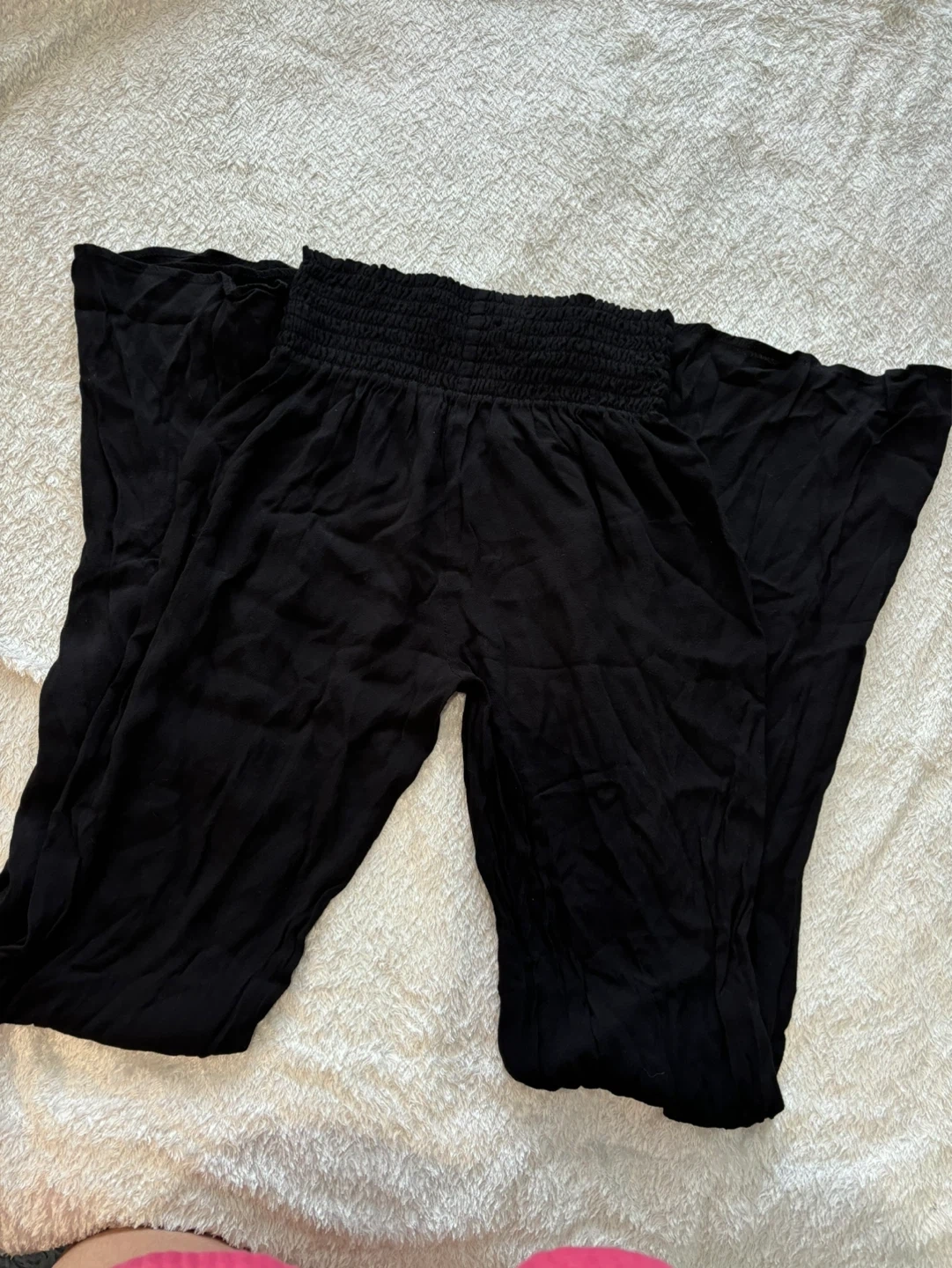 Black wide leg pants from ZARA WOMAN. They're a size small with a smocked elastic waistband and a flowy, wide leg design. Made from a lightweight fabric for comfort.