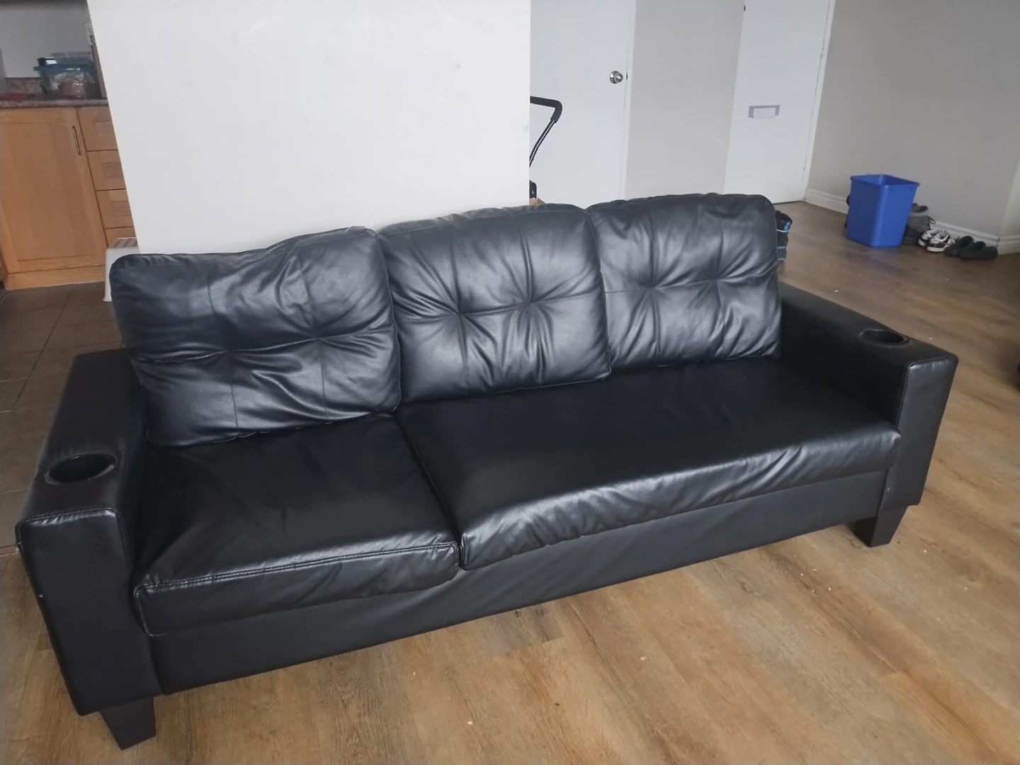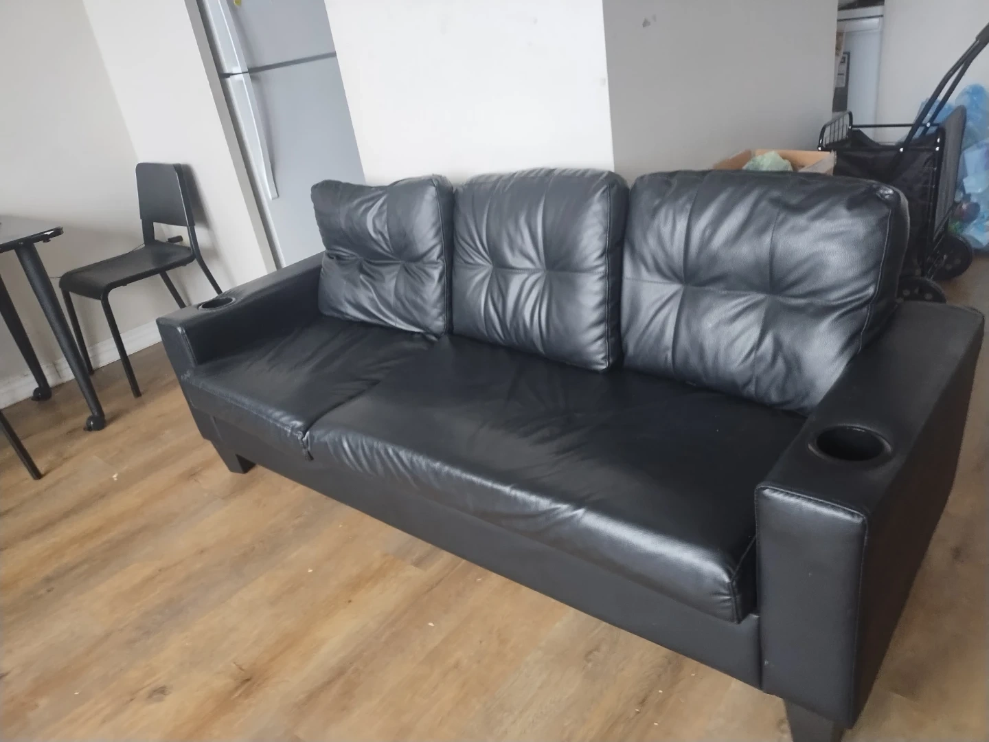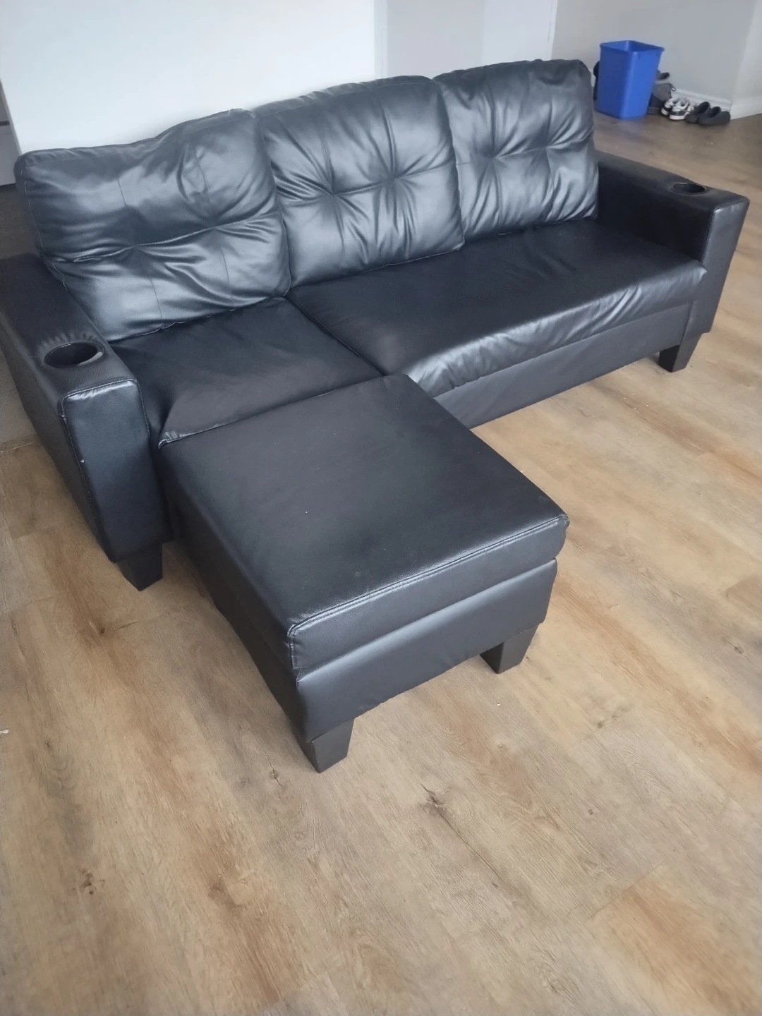 Selling a comfy black leather sofa with an ottoman! It's in great shape and would be perfect for a living room or den. It also has built in cup holders!