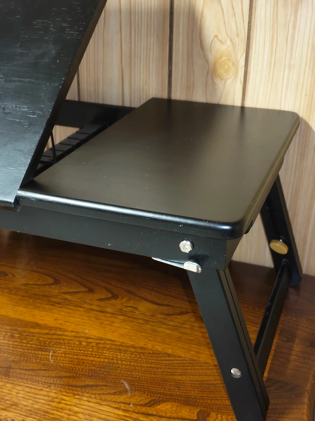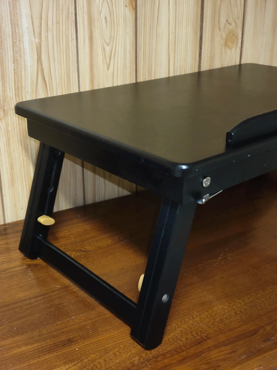 This black lap desk tray is foldable and adjustable. It has a built-in handle for easy carrying. Its compact design makes it convenient for use anywhere. Perfect for working or relaxing from your couch or bed!