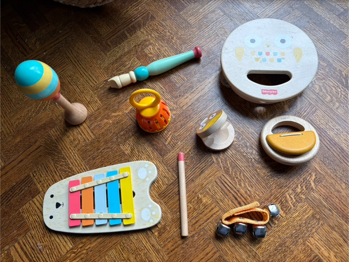 This Fisher-Price wooden musical toy set includes a xylophone, tambourine, maraca, recorder, castanets, and bells. It's perfect for little ones to explore sounds and rhythms!