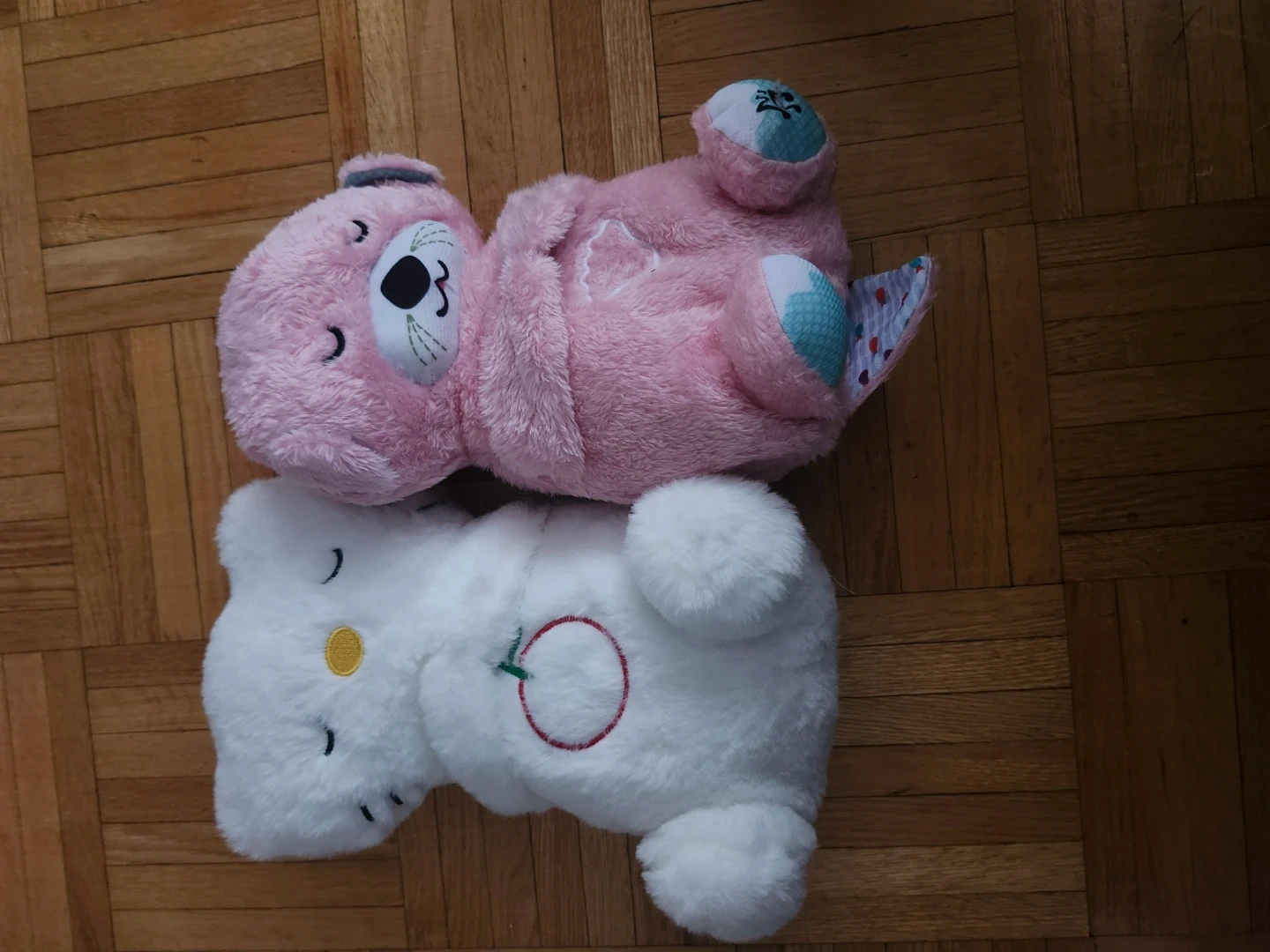 A pink plush bear with embroidered face details and a white plush Hello Kitty-style stuffed animal. Both are made of soft, fluffy material. Great for cuddles!