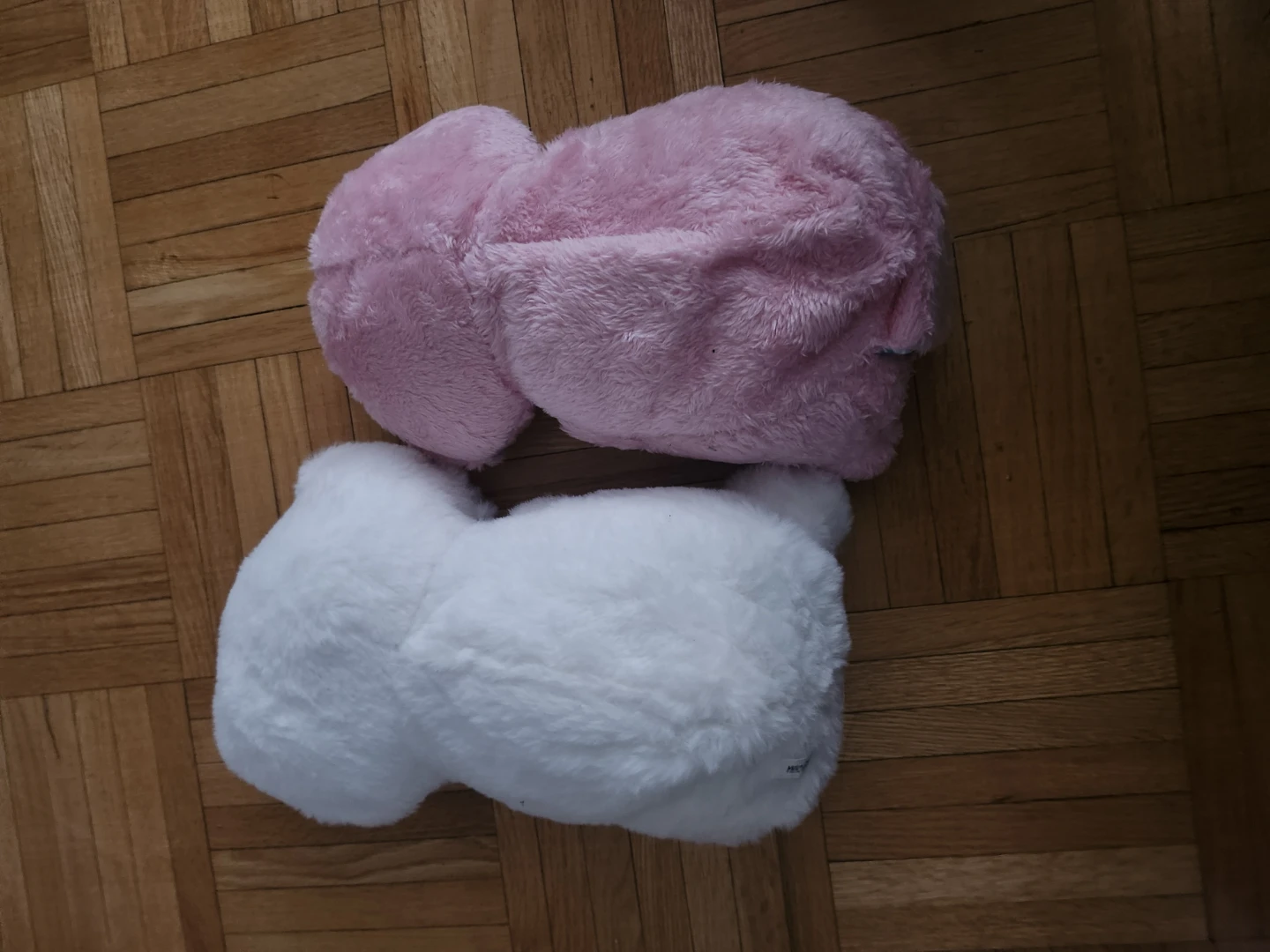 A pink plush bear with embroidered face details and a white plush Hello Kitty-style stuffed animal. Both are made of soft, fluffy material. Great for cuddles!
