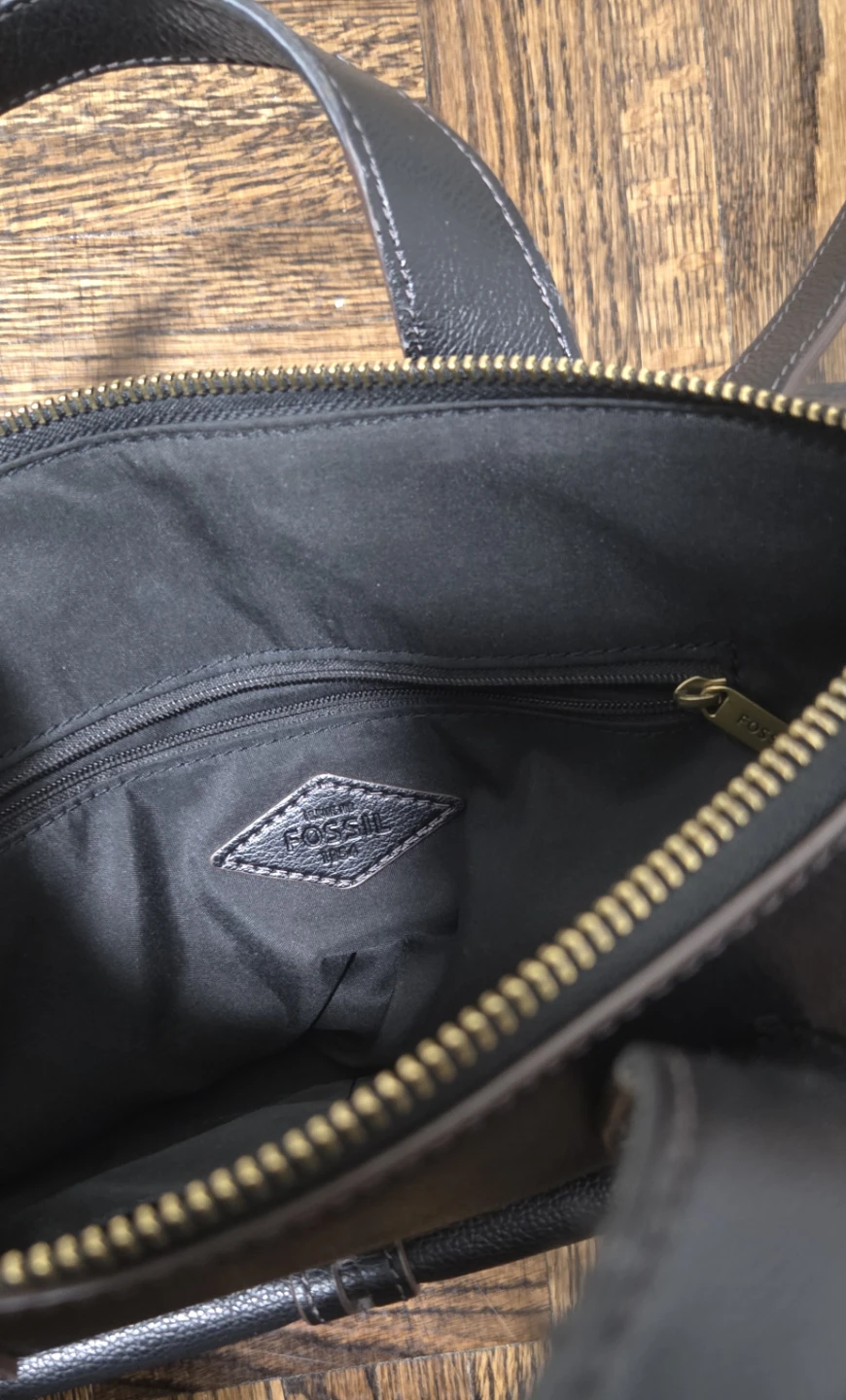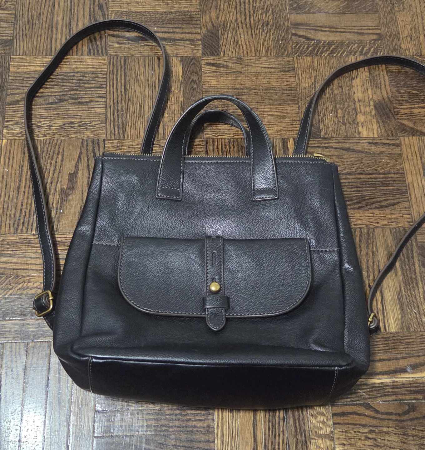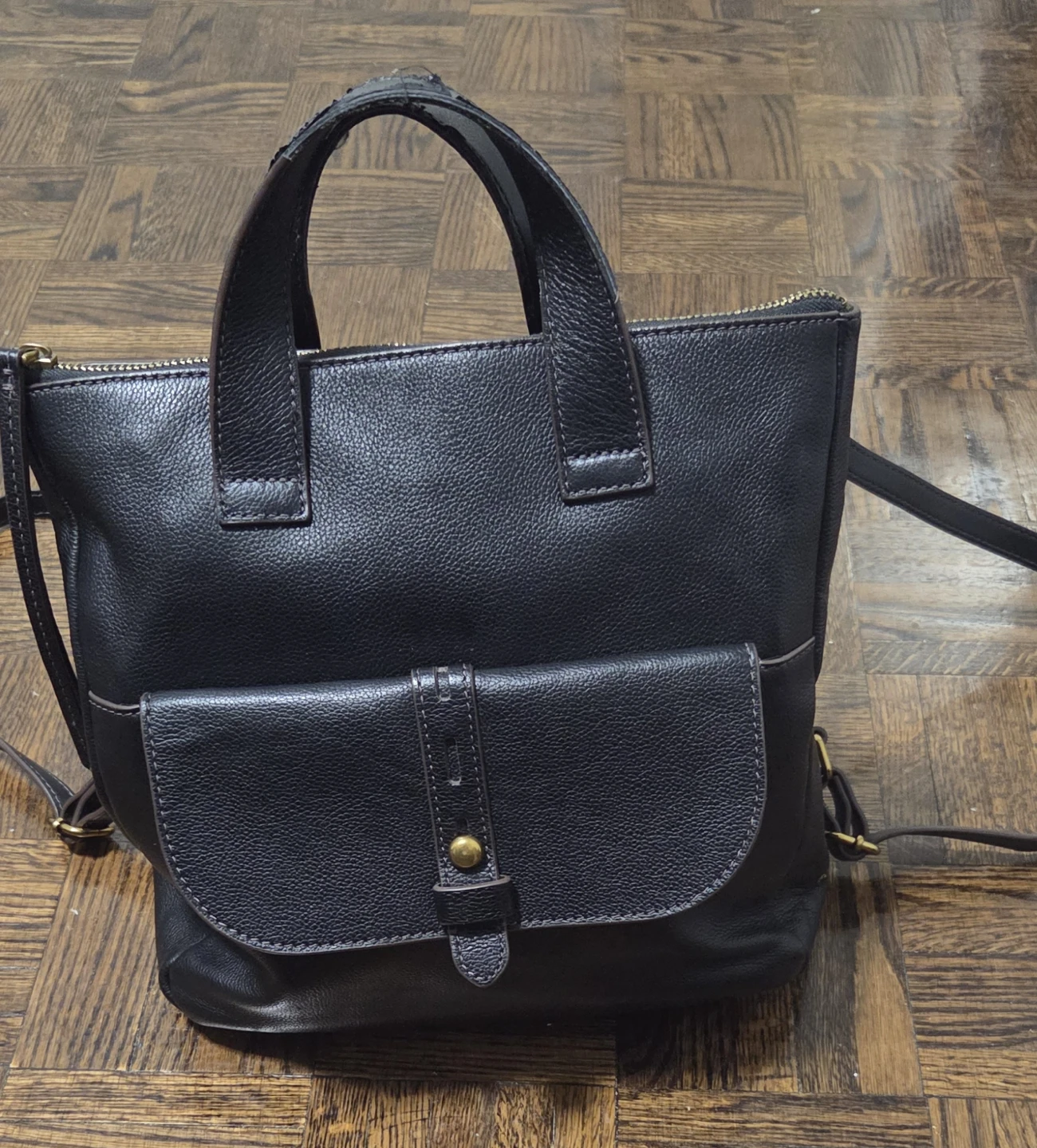This is a gently used Fossil black leather convertible backpack. It can be used as a backpack or a tote bag. It's in great condition and ready for a new owner!