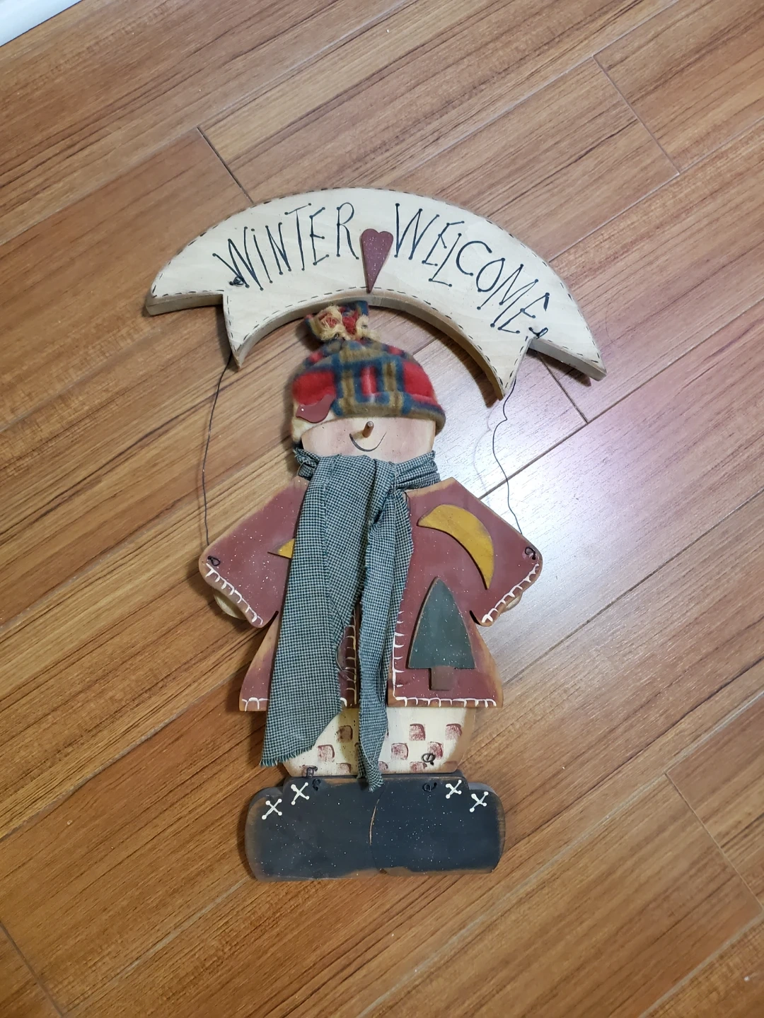 Hand-painted wooden sign featuring a snowman with a "Winter Welcome" banner. This decorative piece has a plaid hat and scarf. It's a charming addition to any entryway during the colder months!