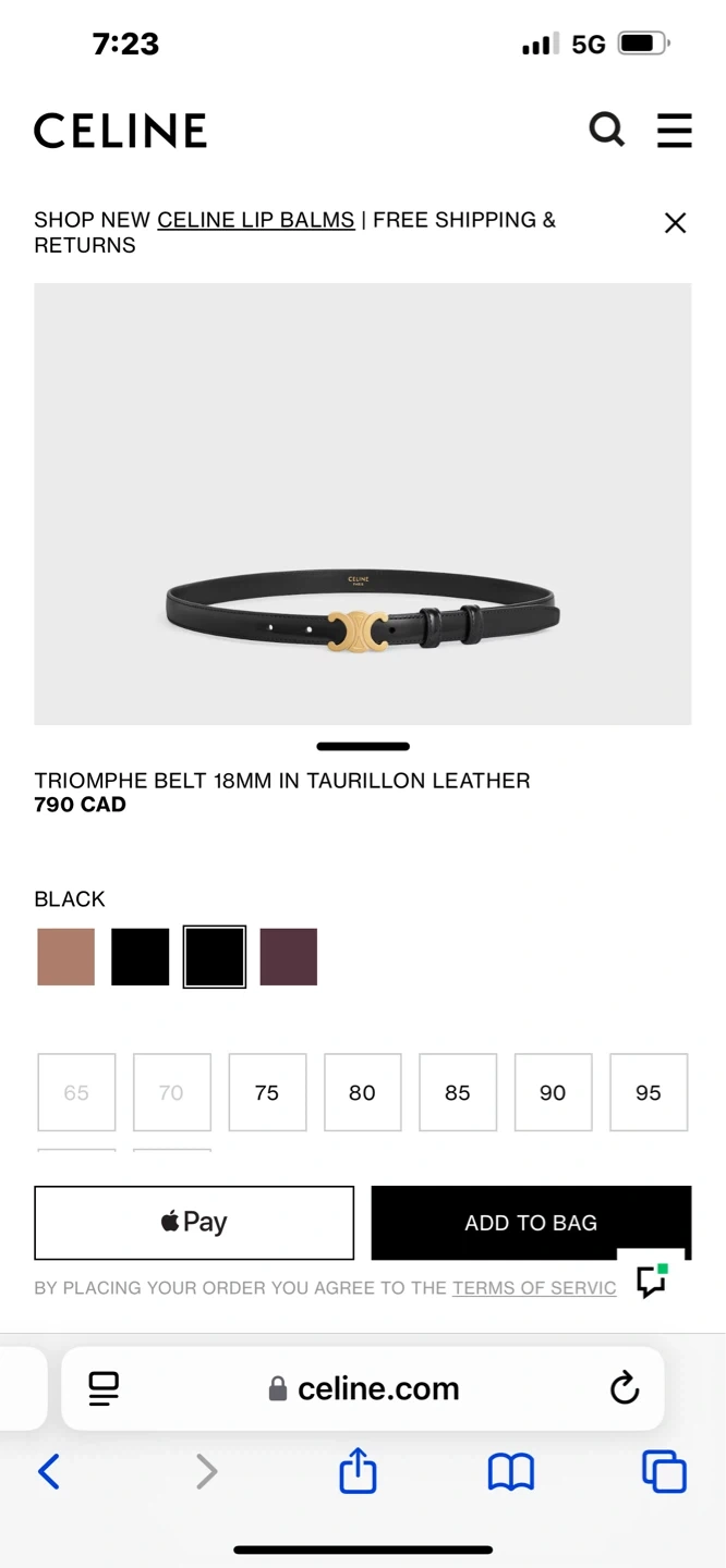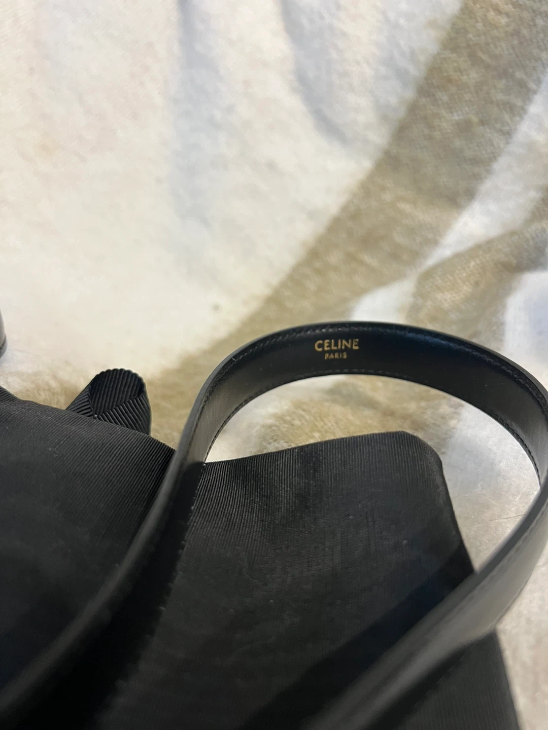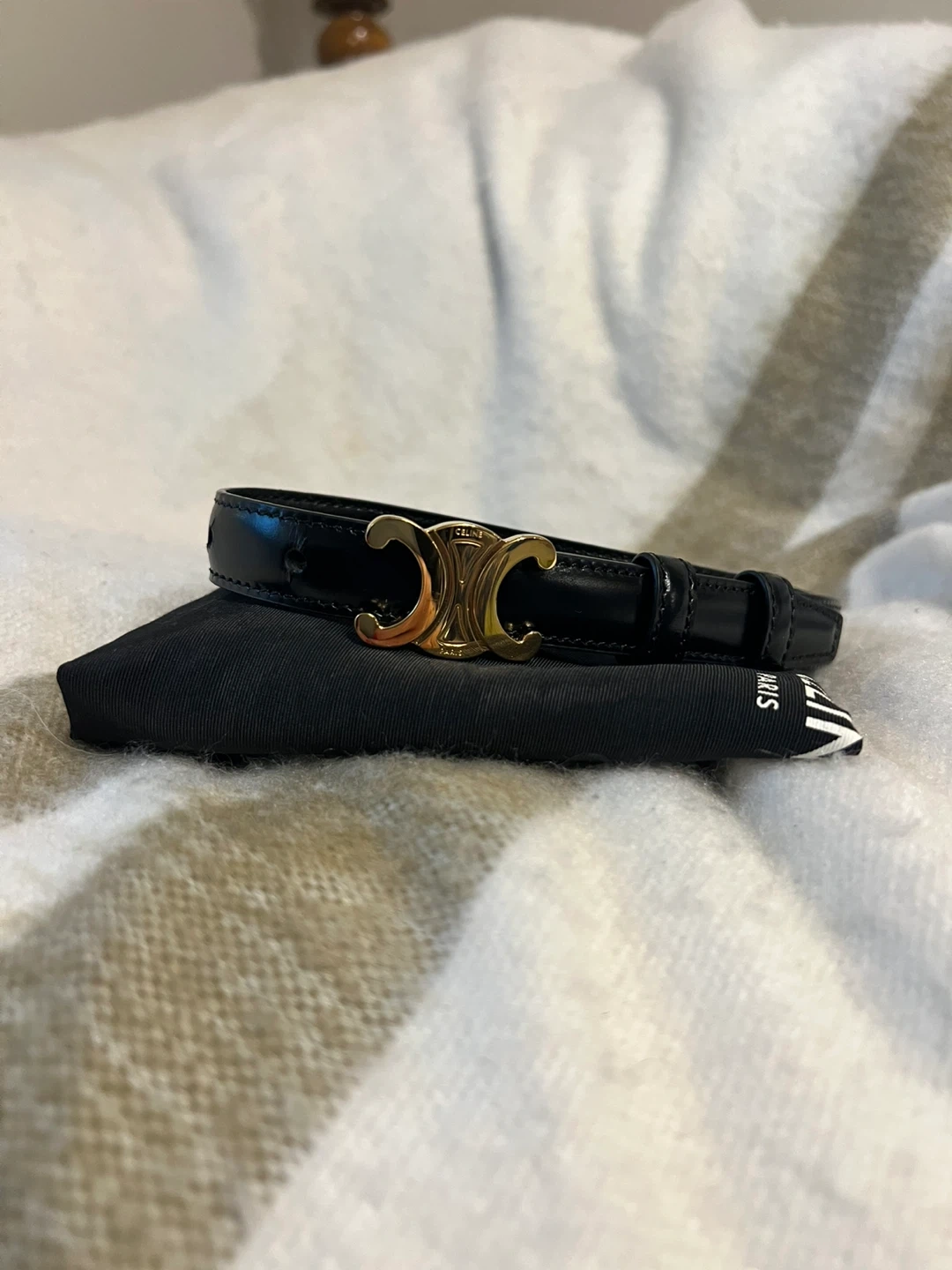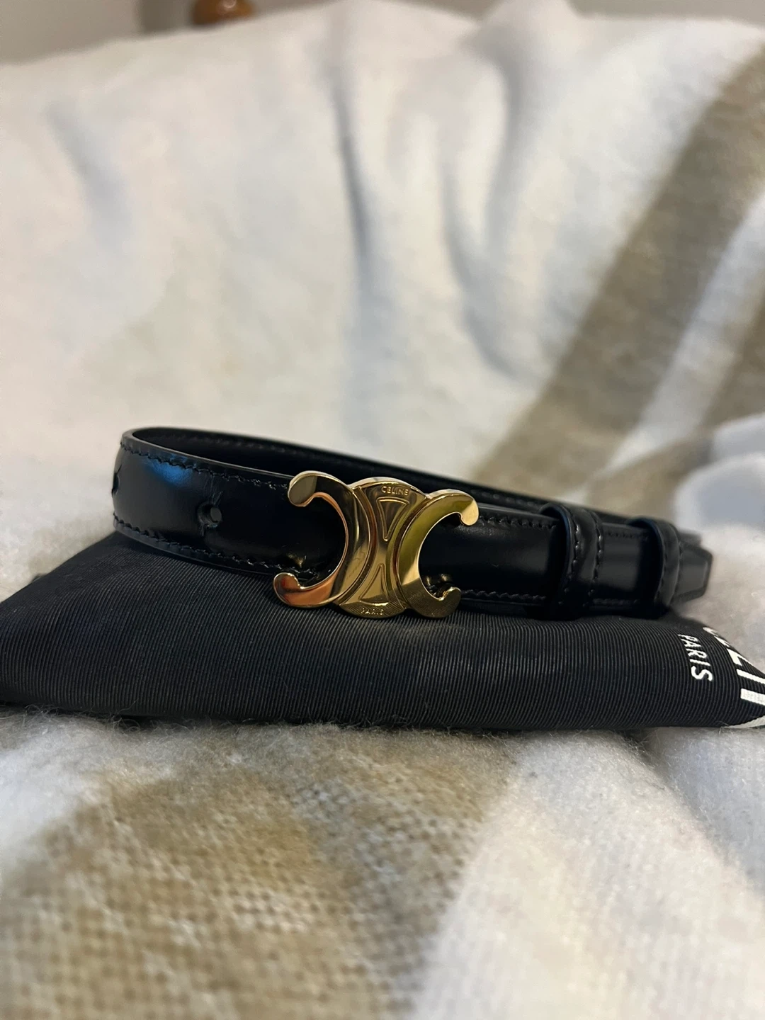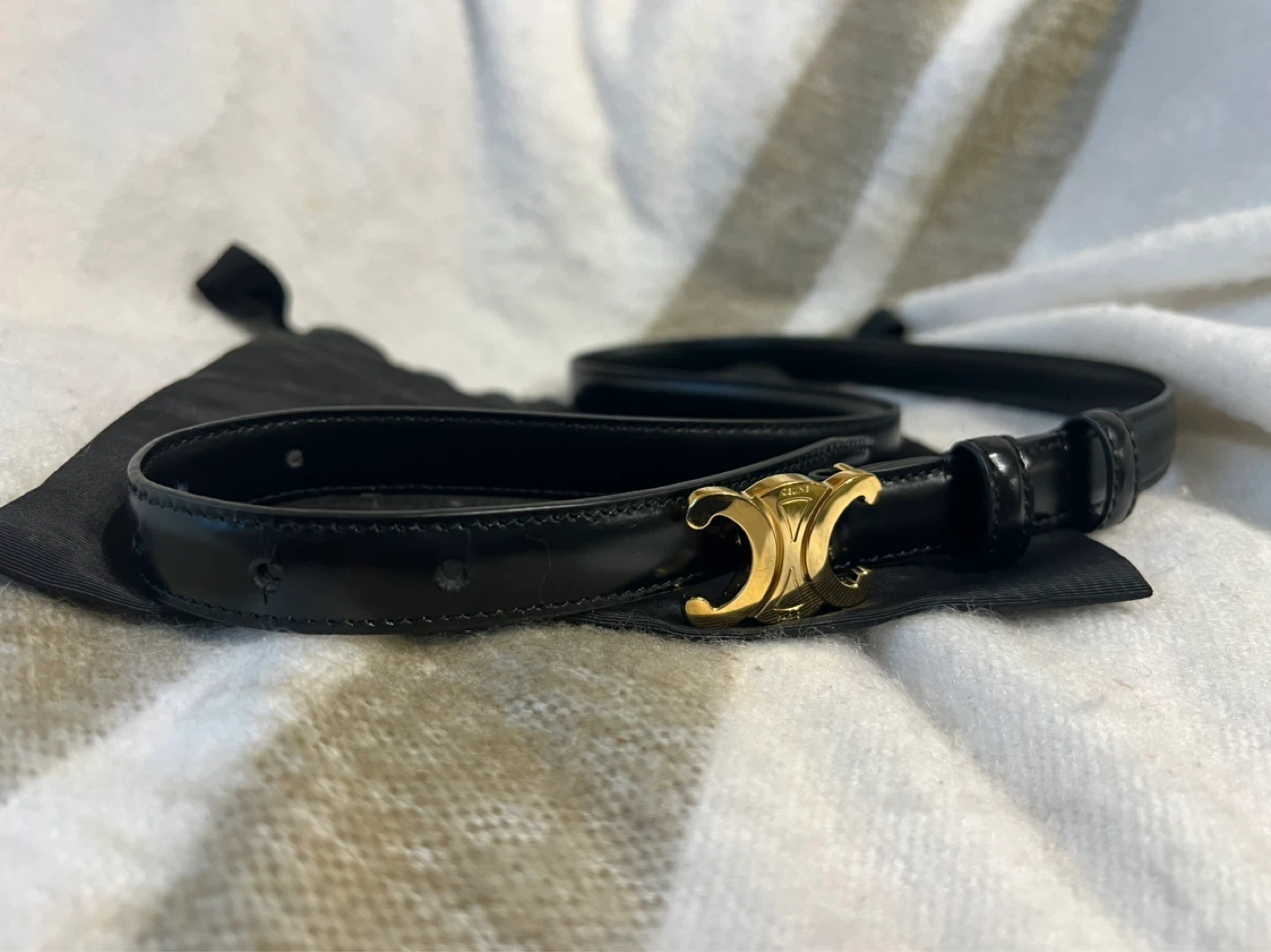 Classic Celine belt in black leather with the iconic gold-tone Triomphe buckle. It's made in Italy and comes with its original dust bag. Leather material.