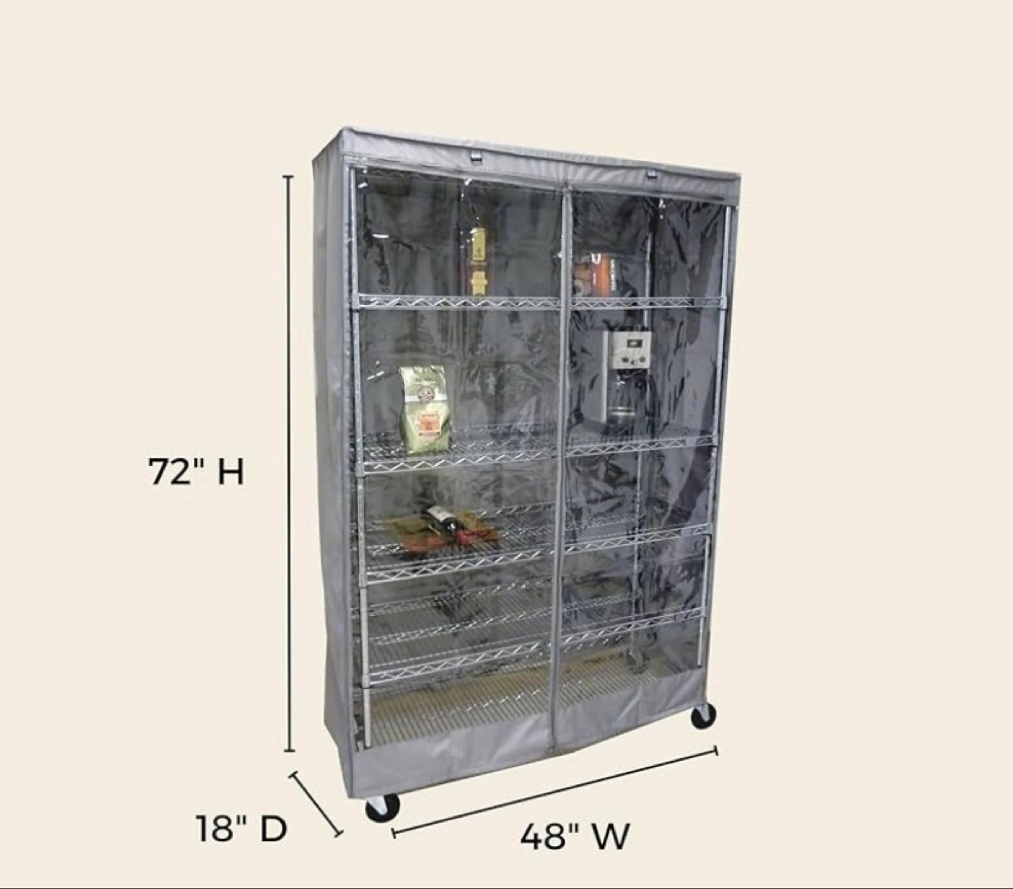 Heavy-duty rolling shelving unit. Features a fabric cover with clear vinyl panels. Unique T-zipper design. Two straps included to roll up the front or back panel. Measures 72"H x 48"W x 18"D.