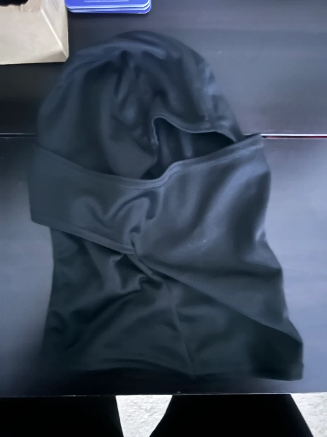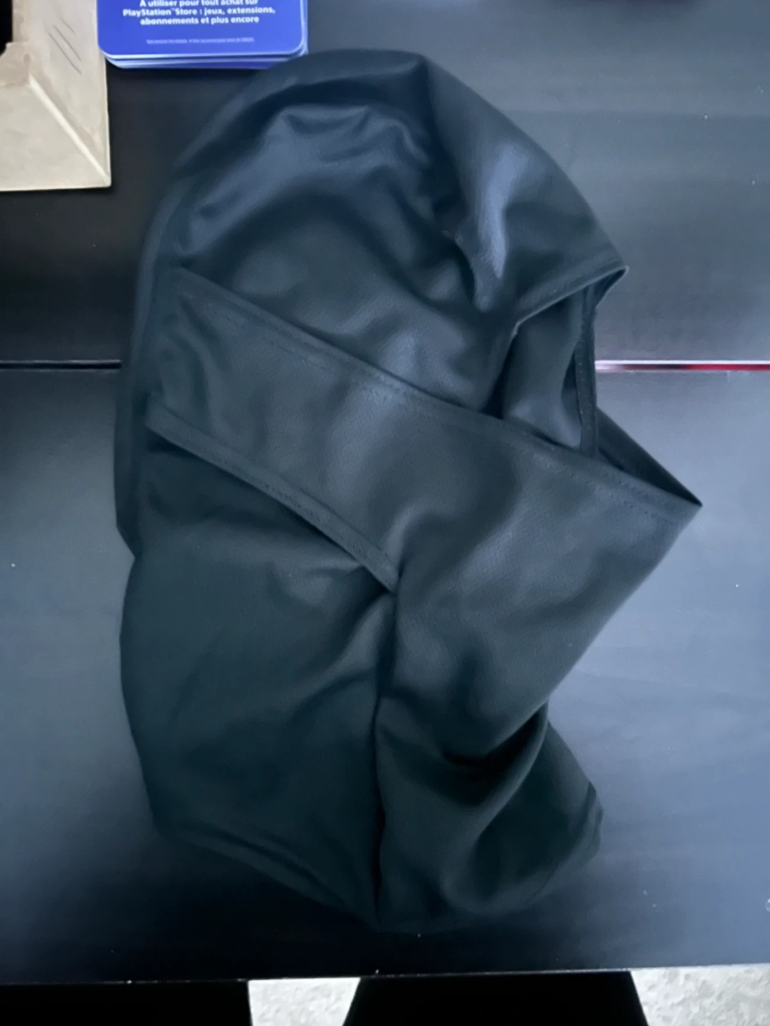 This black balaclava provides full face and neck coverage. It's made of a soft, breathable fabric. Useful for cold weather activities like skiing or snowboarding. It's a one-size-fits-most design.