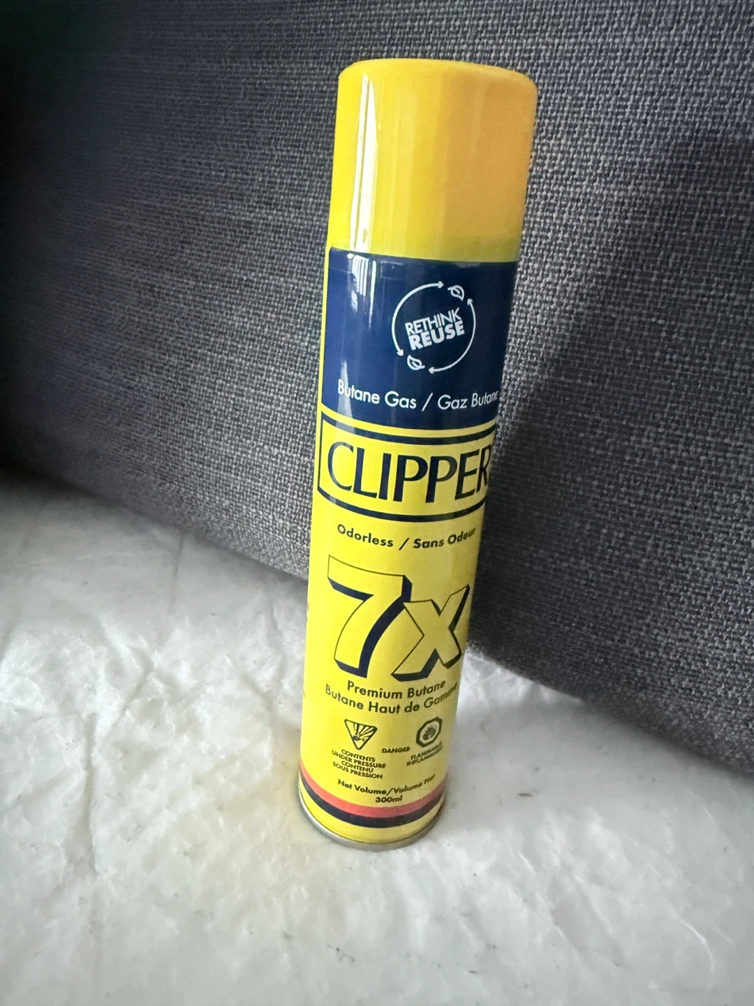 Clipper 7X Premium Butane gas. It's odorless and comes in a 300ml can. This can contains butane gas.