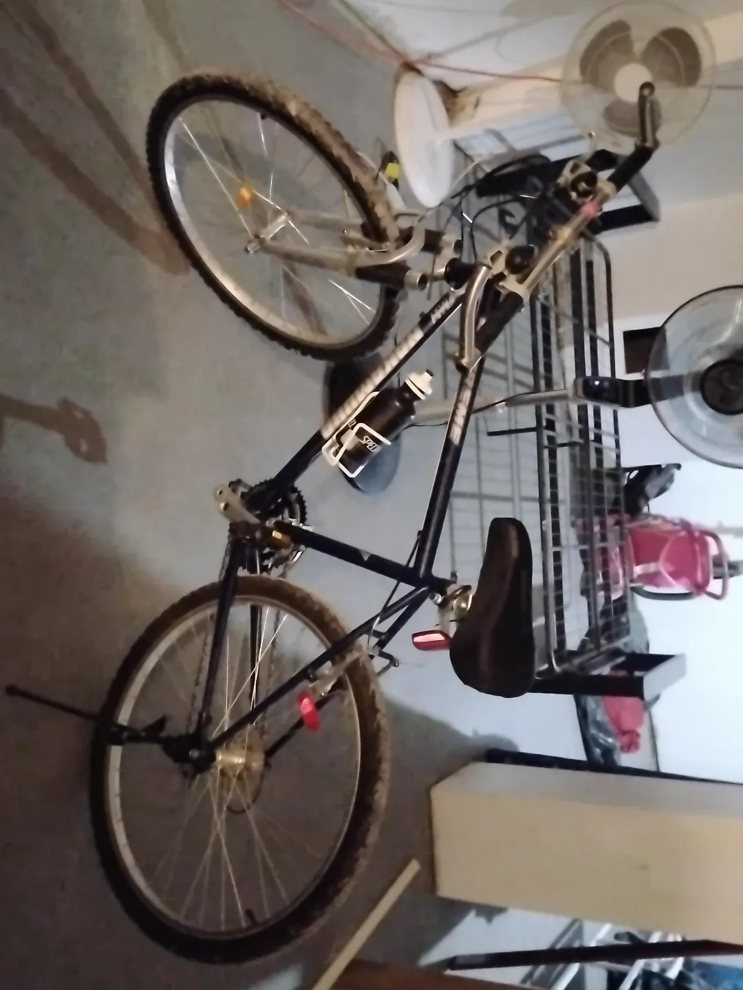 This is a Specialized mountain bike. It's a great option for hitting trails or cruising around town. It comes with a water bottle holder and a kickstand. It's ready for your next adventure!