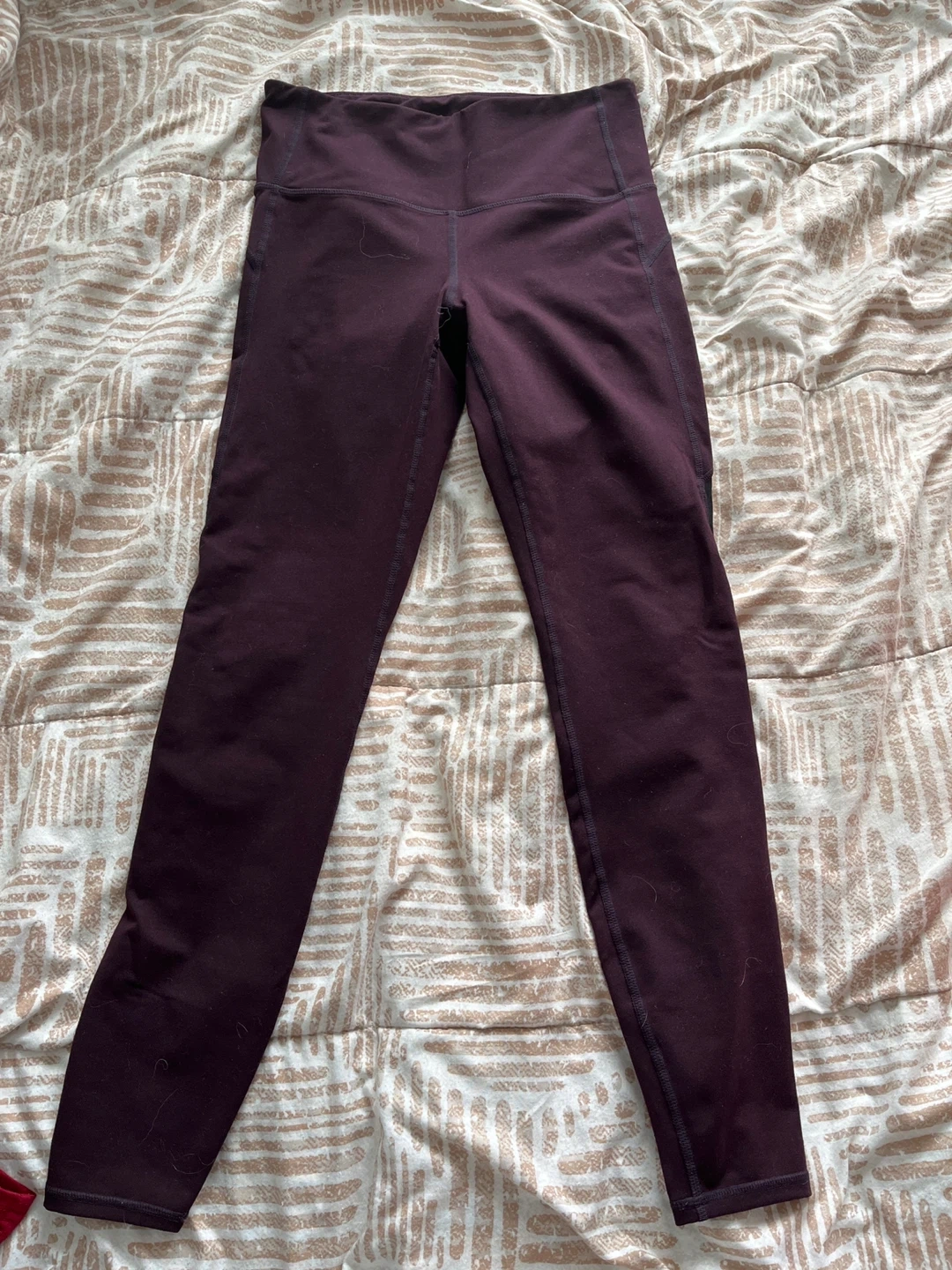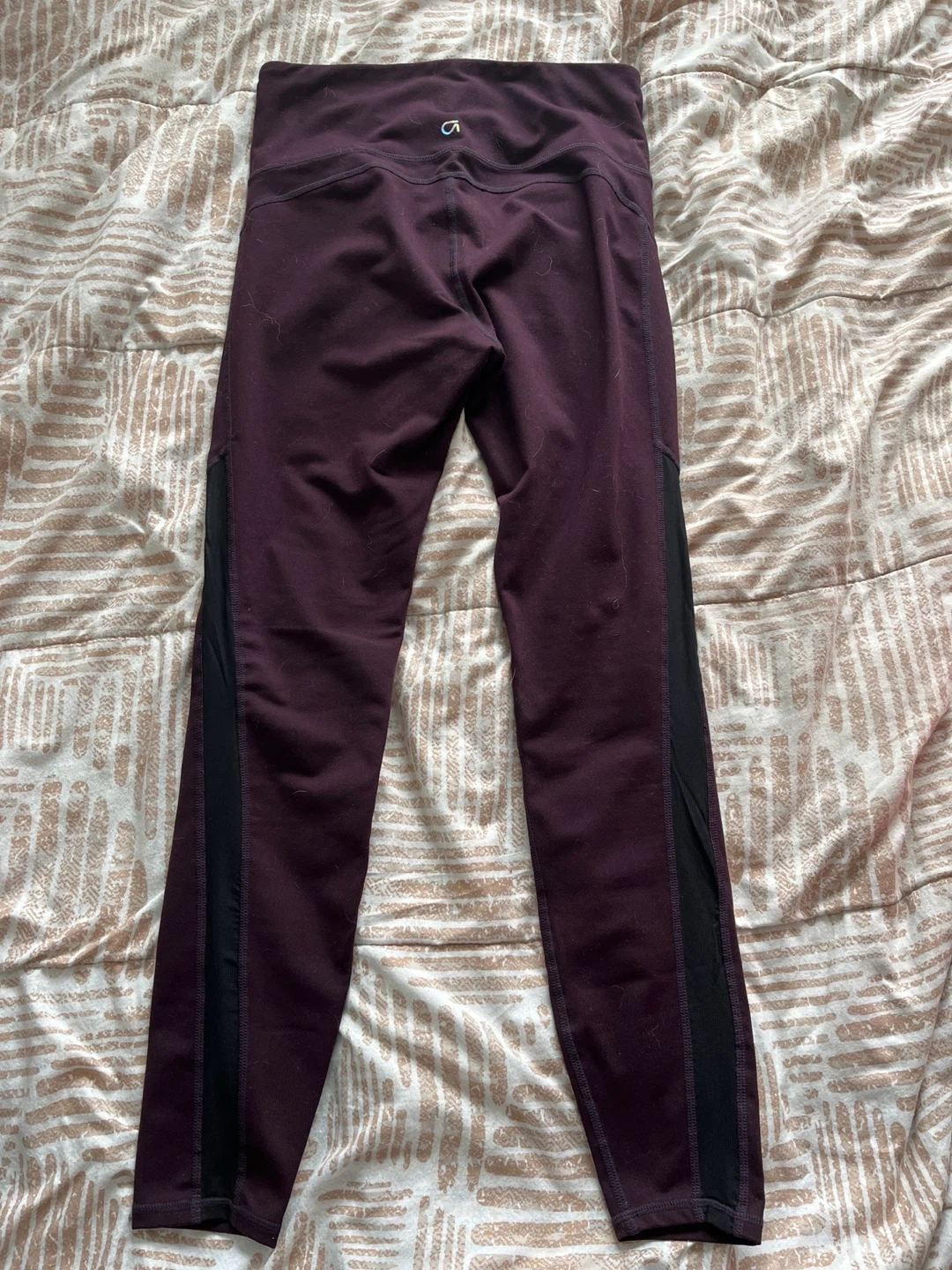 These GapFit leggings are a rich burgundy colour with black mesh paneling on the sides. They have a comfortable high-waisted fit. Perfect for workouts or casual wear!