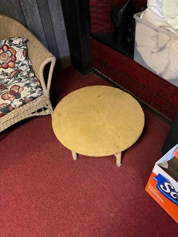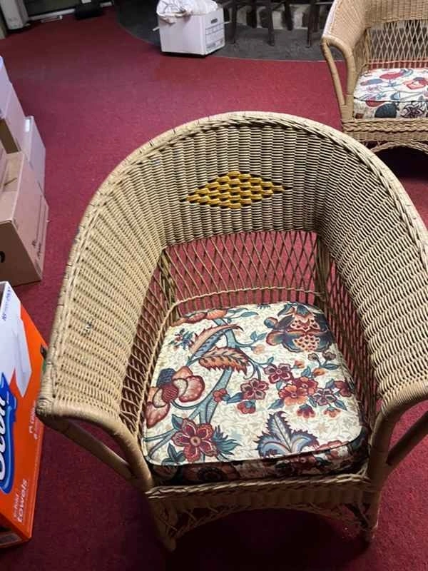 Vintage wicker patio furniture set includes a three-seat sofa, two matching armchairs, and a round coffee table. This charming collection features a classic woven natural fiber construction with decorative yellow diamond accents on the high curved backs. The seating comes with plush cushions and coordinating throw pillows in a vibrant floral pattern with shades of red, blue, and tan. Perfect for a sunroom, covered porch, or bohemian living space, this sturdy set offers a timeless cottage or coastal aesthetic. The coffee table features a matching braided edge detail. Pick up only in Franklin Square.