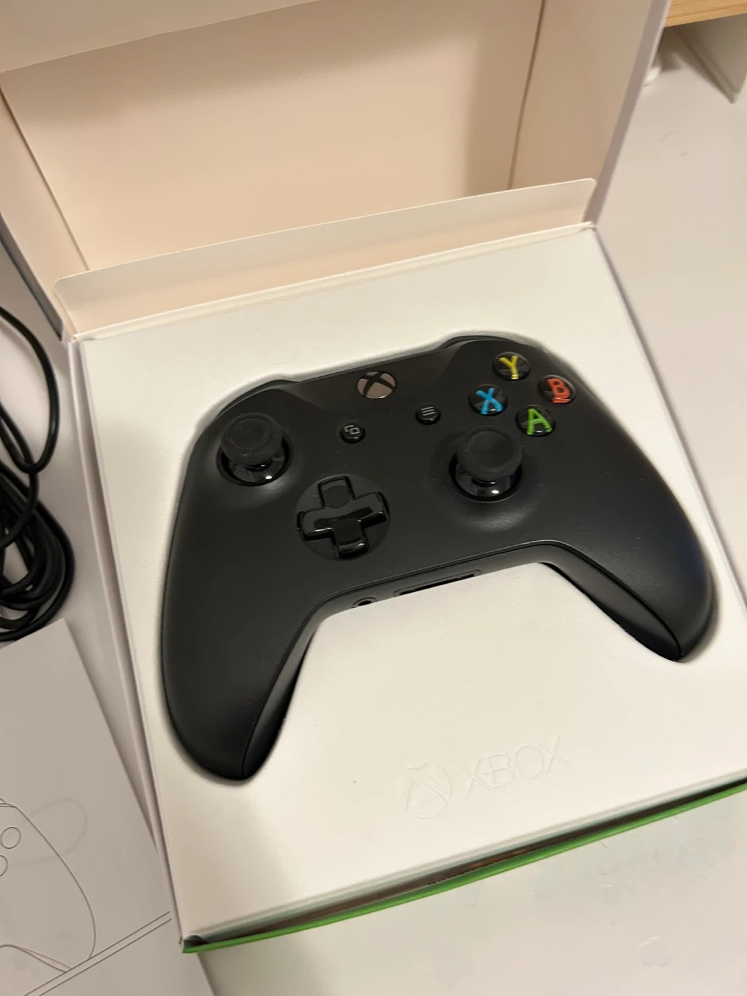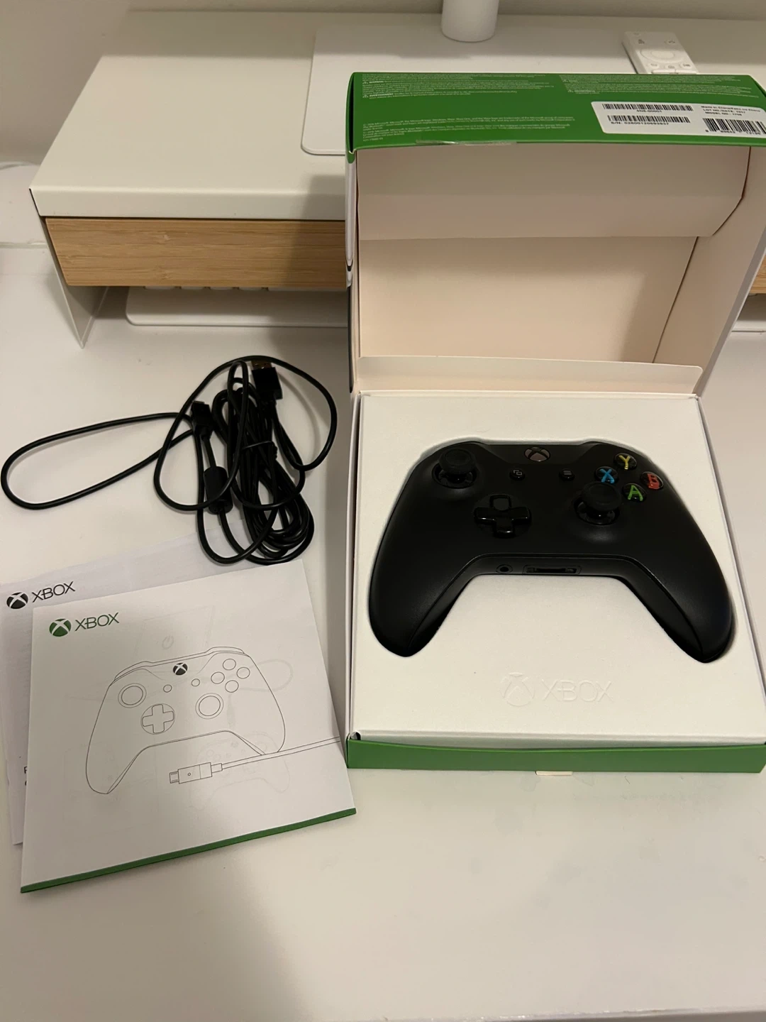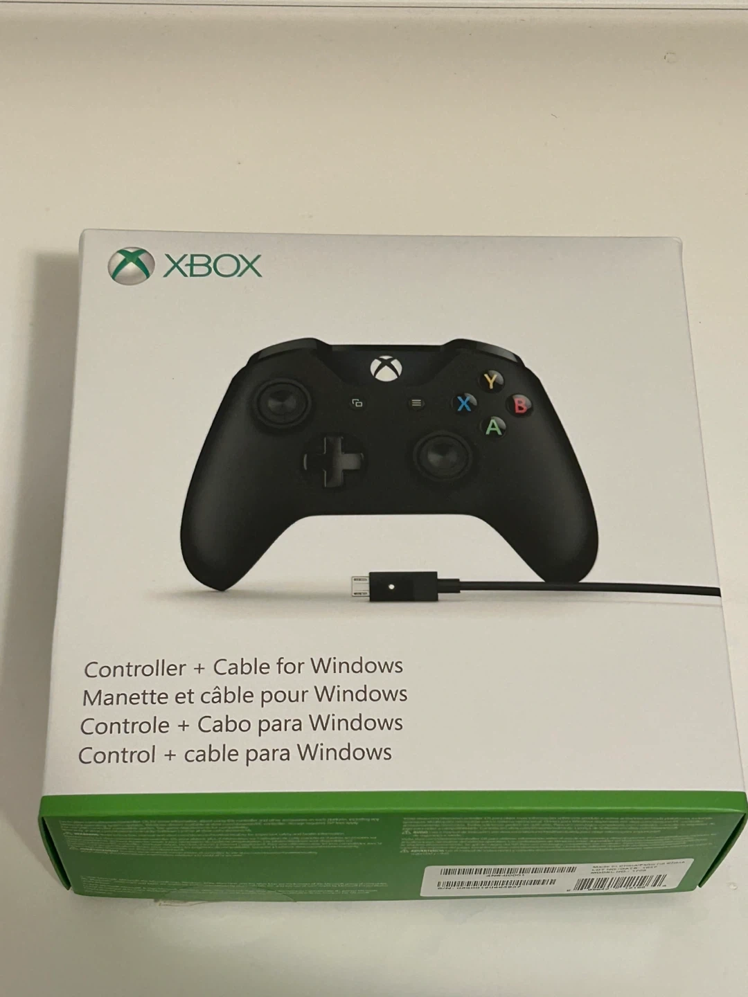 This is an Xbox controller with a cable for Windows. It comes with the controller, a cable, and instructions. It's black and includes all original packaging.