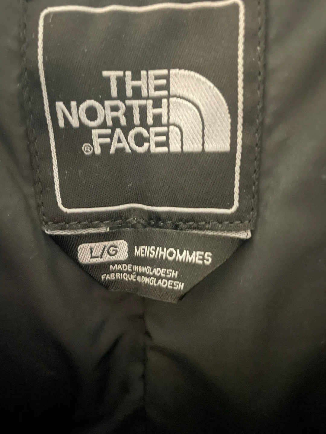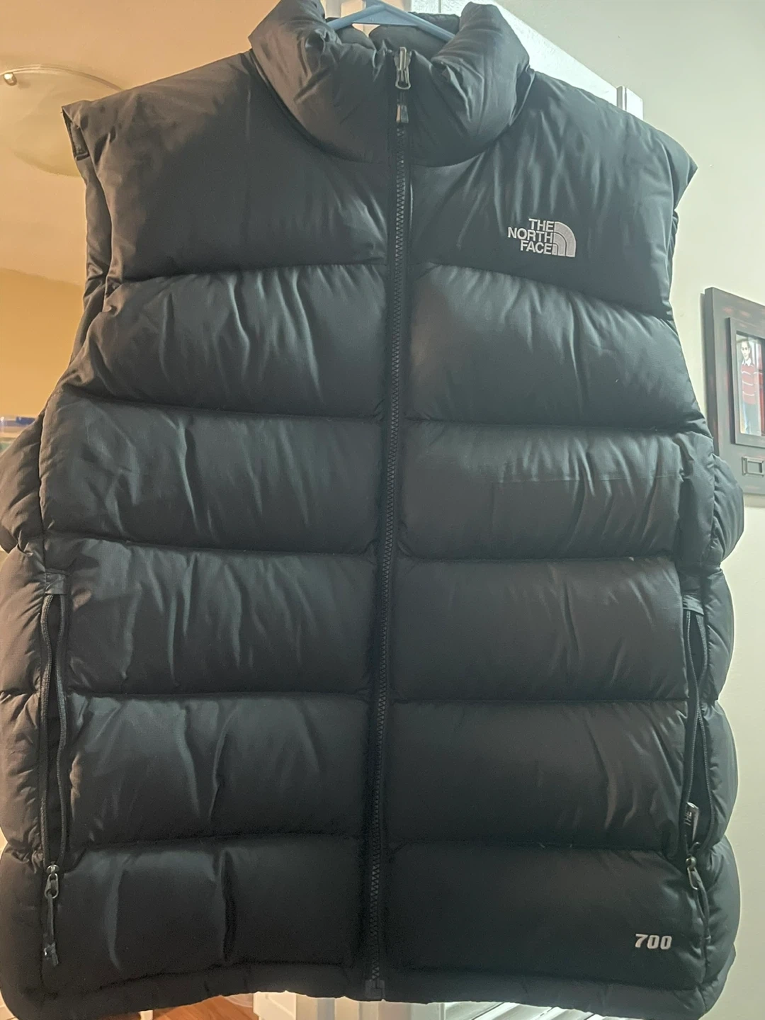 This is a black puffer vest from The North Face. It's a men's size Large. The vest features 700 fill down for warmth.
