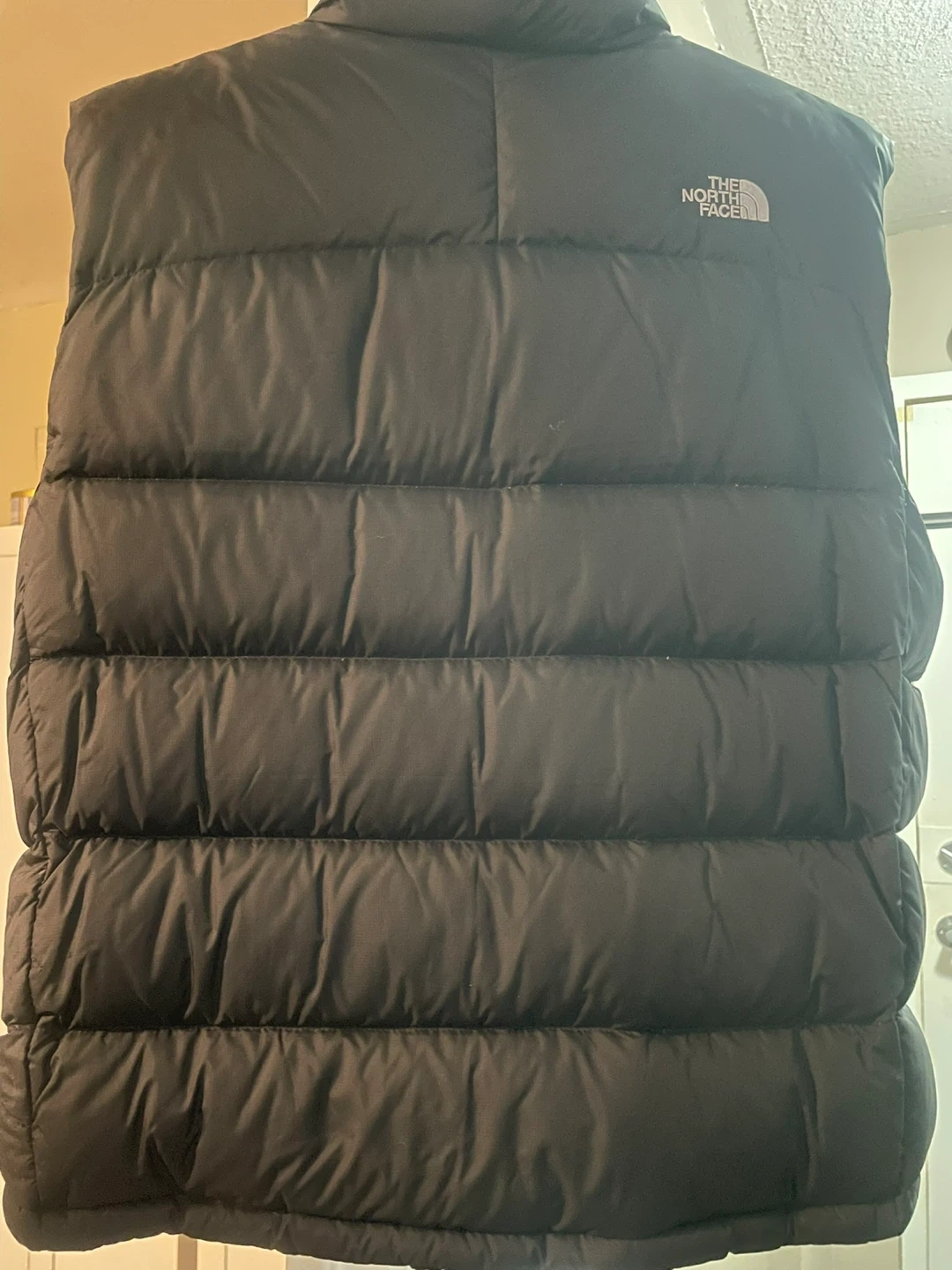 This is a black puffer vest from The North Face. It's a men's size Large. The vest features 700 fill down for warmth.