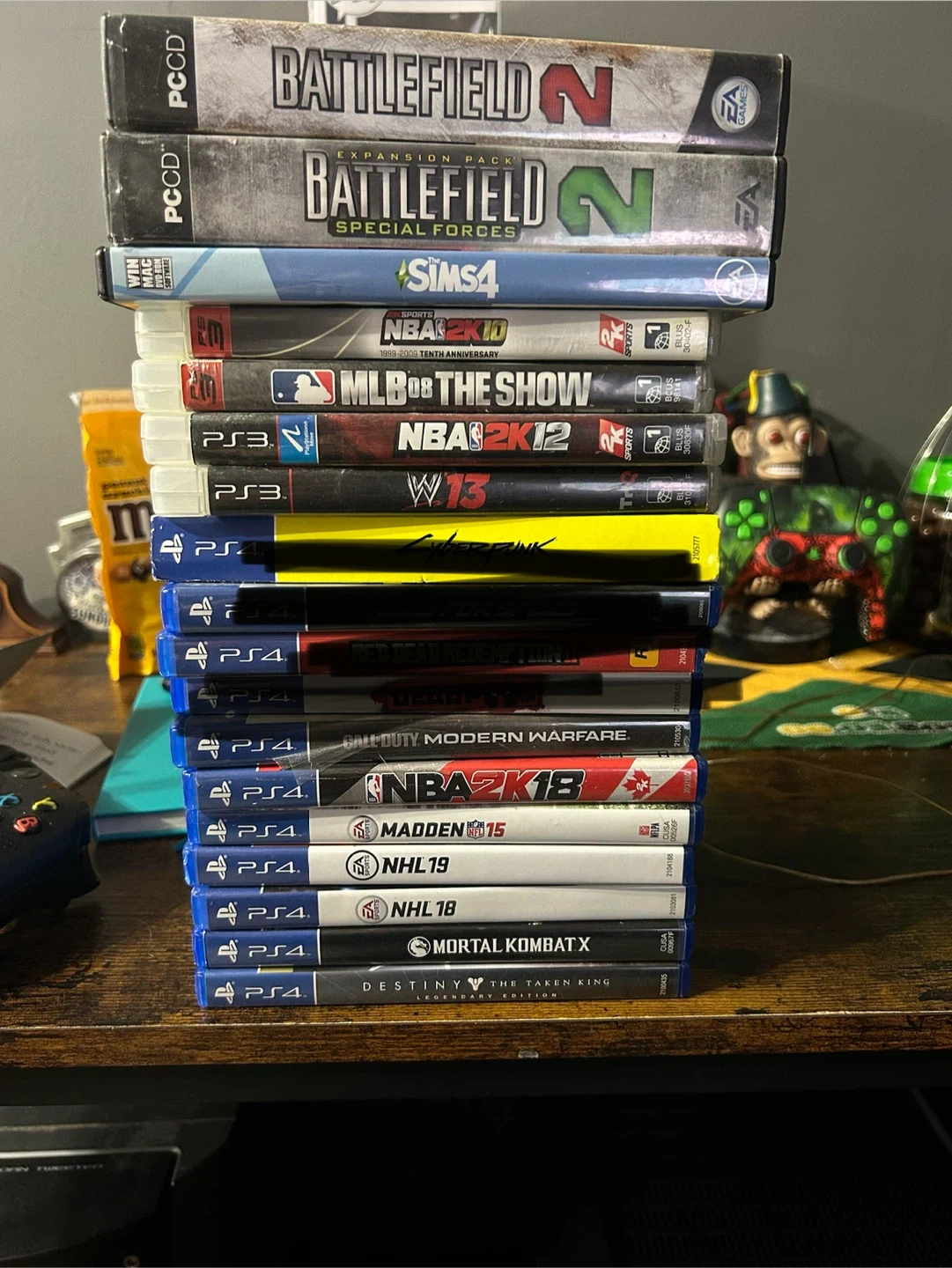 A collection of PlayStation 4 video games including NBA 2K18, Madden 15, NHL 19, NHL 18, Mortal Kombat X, and Destiny The Taken King. Also includes older titles like Battlefield 2, The Sims 4, and Red Dead Redemption II. 5-10 dollars each