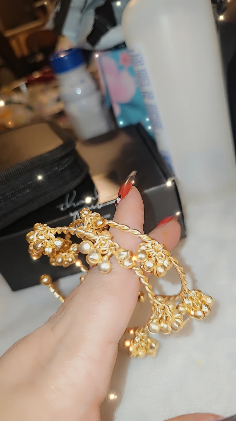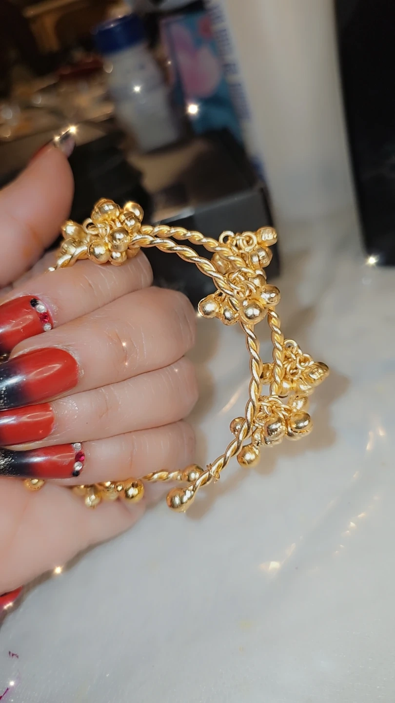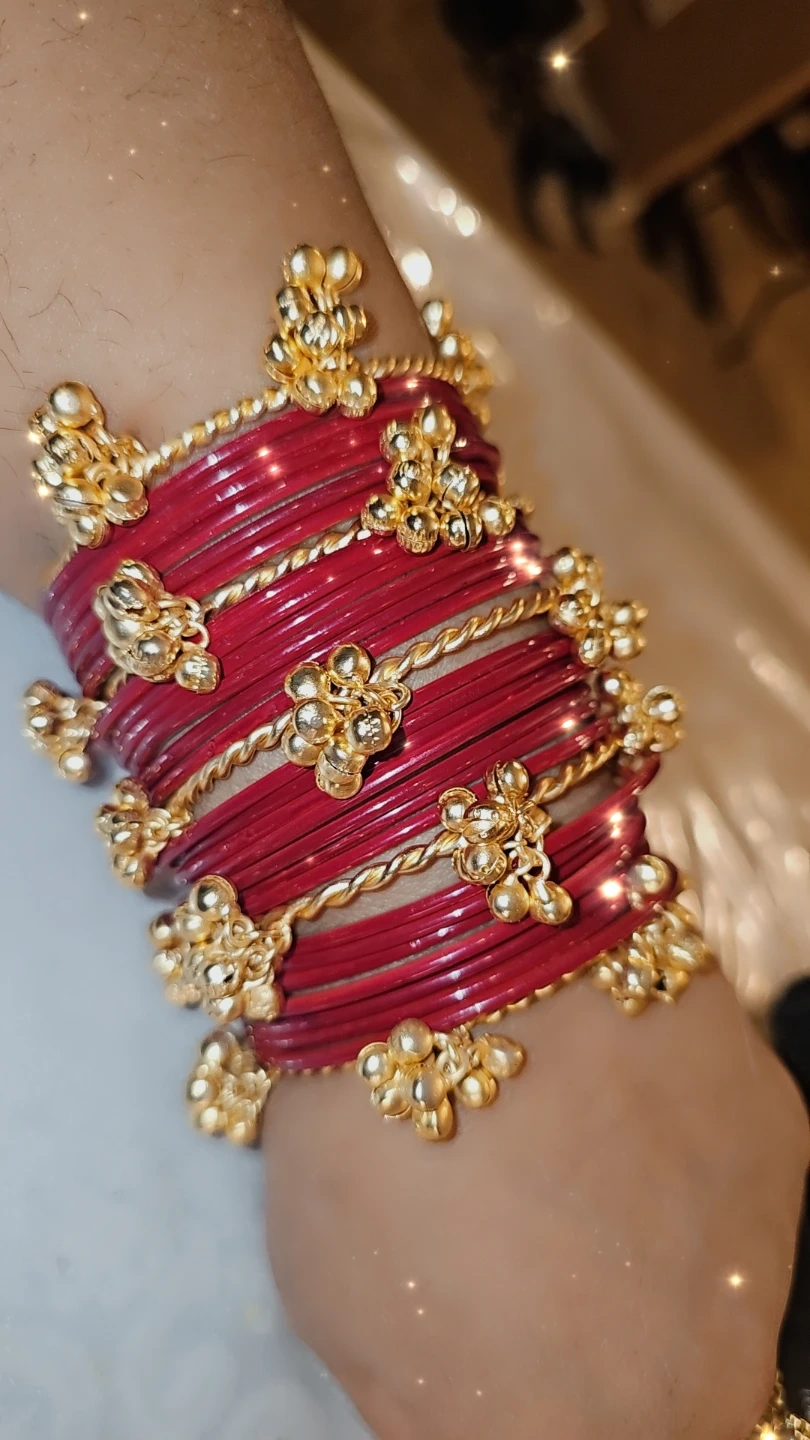 A set of vibrant bangles adorned with intricate gold-tone charms and twisted detailing. These bangles offer a festive and traditional look. They're perfect for special occasions or adding a splash of colour to your everyday wear. $25 foe 2 ghungro bangles