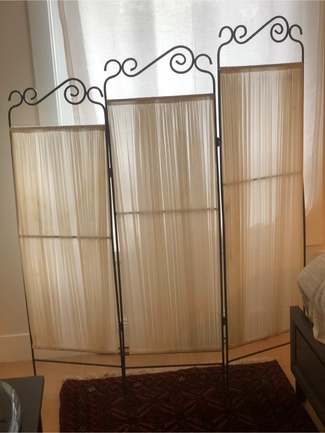 This elegant screen divider features a wrought iron frame with decorative scrollwork. It has three cream-coloured fabric panels that offer a light and airy feel. This screen is perfect for dividing spaces or adding a touch of charm to a room.