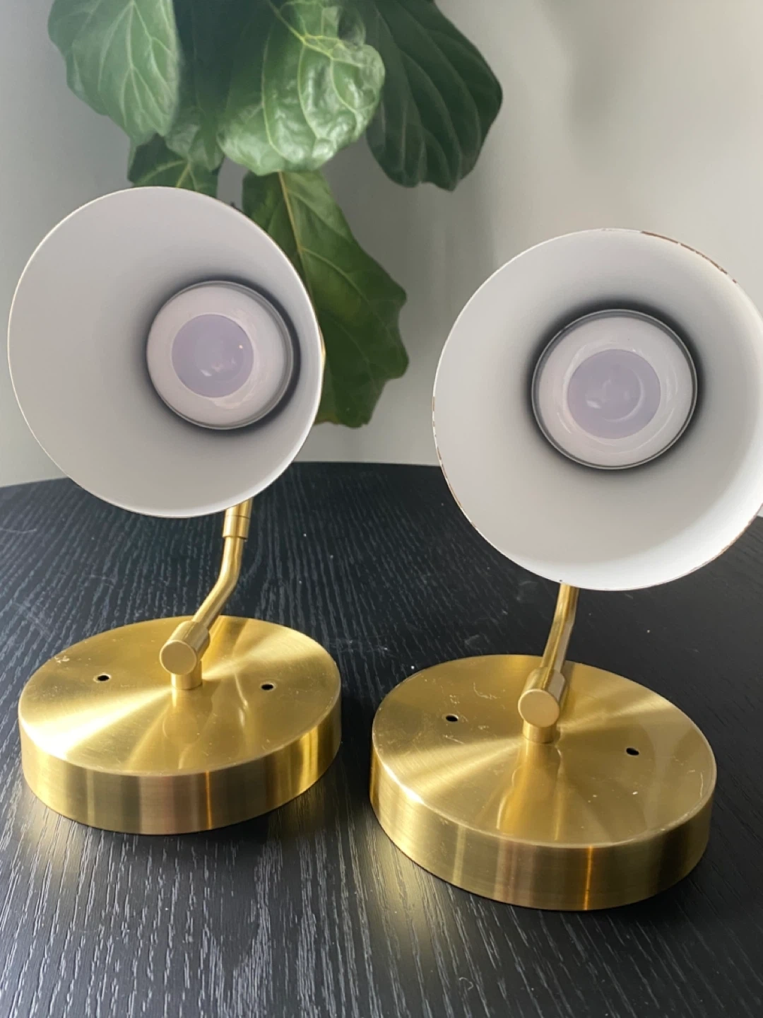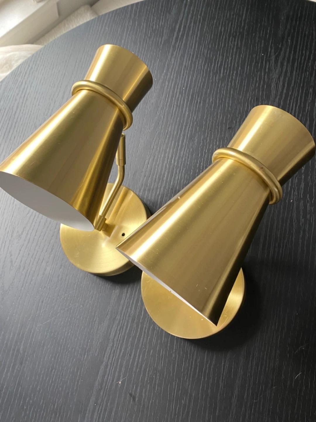 Each sconce has a cone-shaped shade with adjustable head to angle up or down.