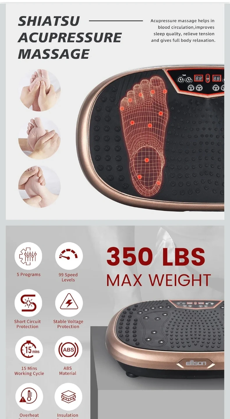 This Ellson whole-body workout vibration platform offers shiatsu acupressure massage for improved circulation and relaxation. It has 5 programs, 99 speed levels, and a 15-minute working cycle. It supports up to 350 lbs max weight and includes resistance bands and a remote. This machine is useful for promoting wellness and recovery.