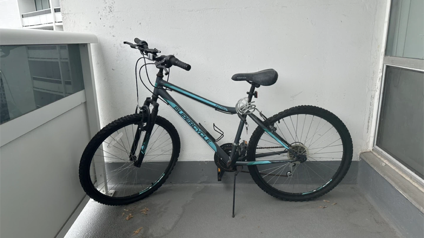 This is a Supercycle Nitro mountain bike. It has a dark grey frame with teal accents and a black seat. It includes a water bottle cage and a cable lock.