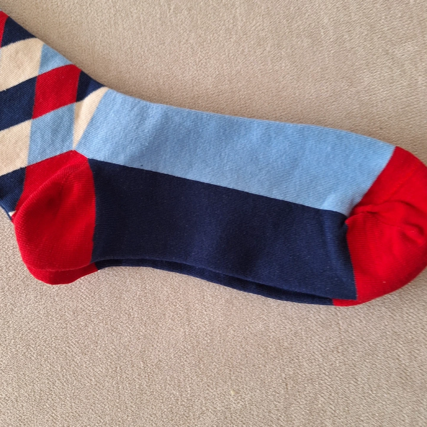These Happy Socks feature a classic argyle pattern. They're a comfy crew sock style. Red, blue, and cream diamonds with navy and light blue stripes. Perfect for adding some flair to your everyday look! Never worn