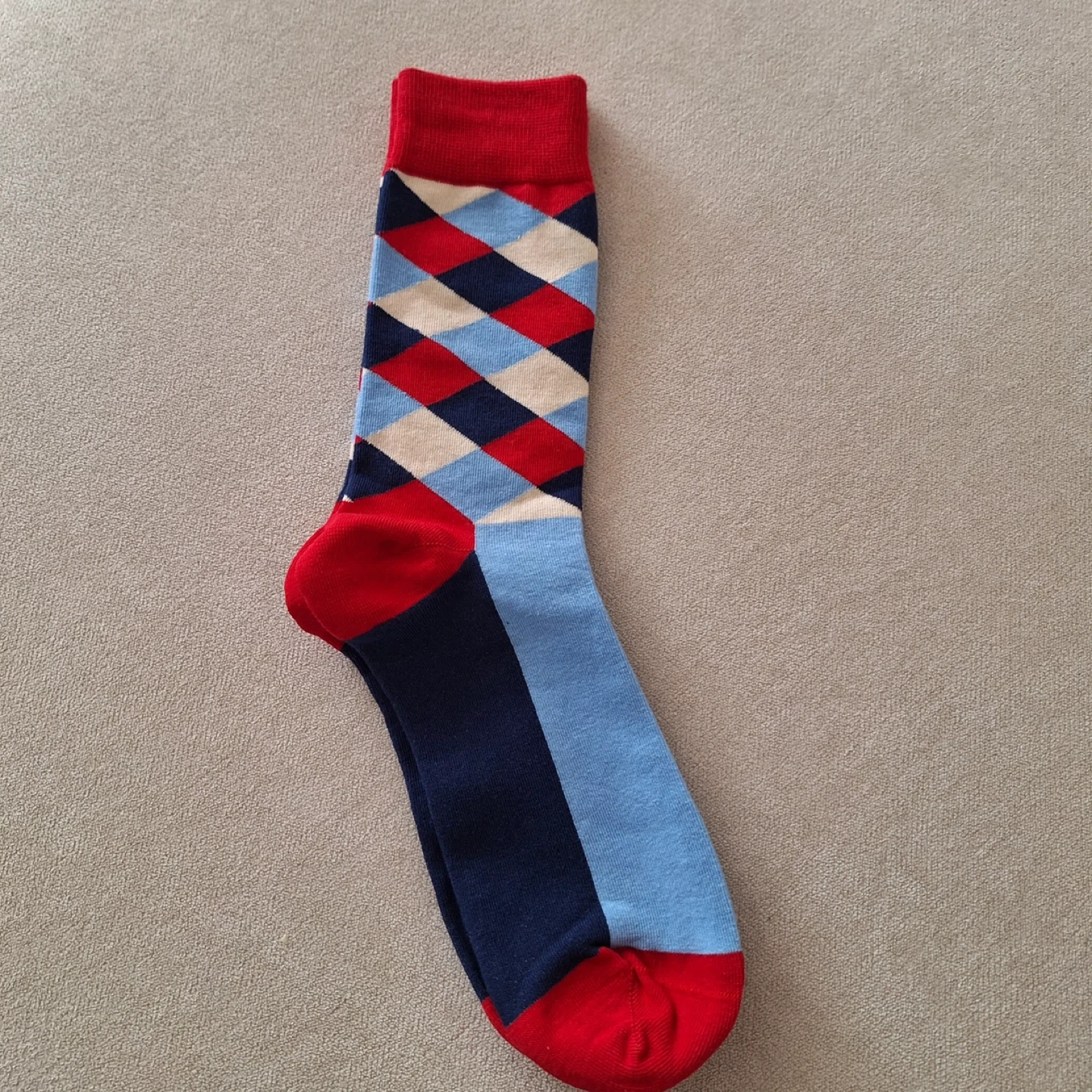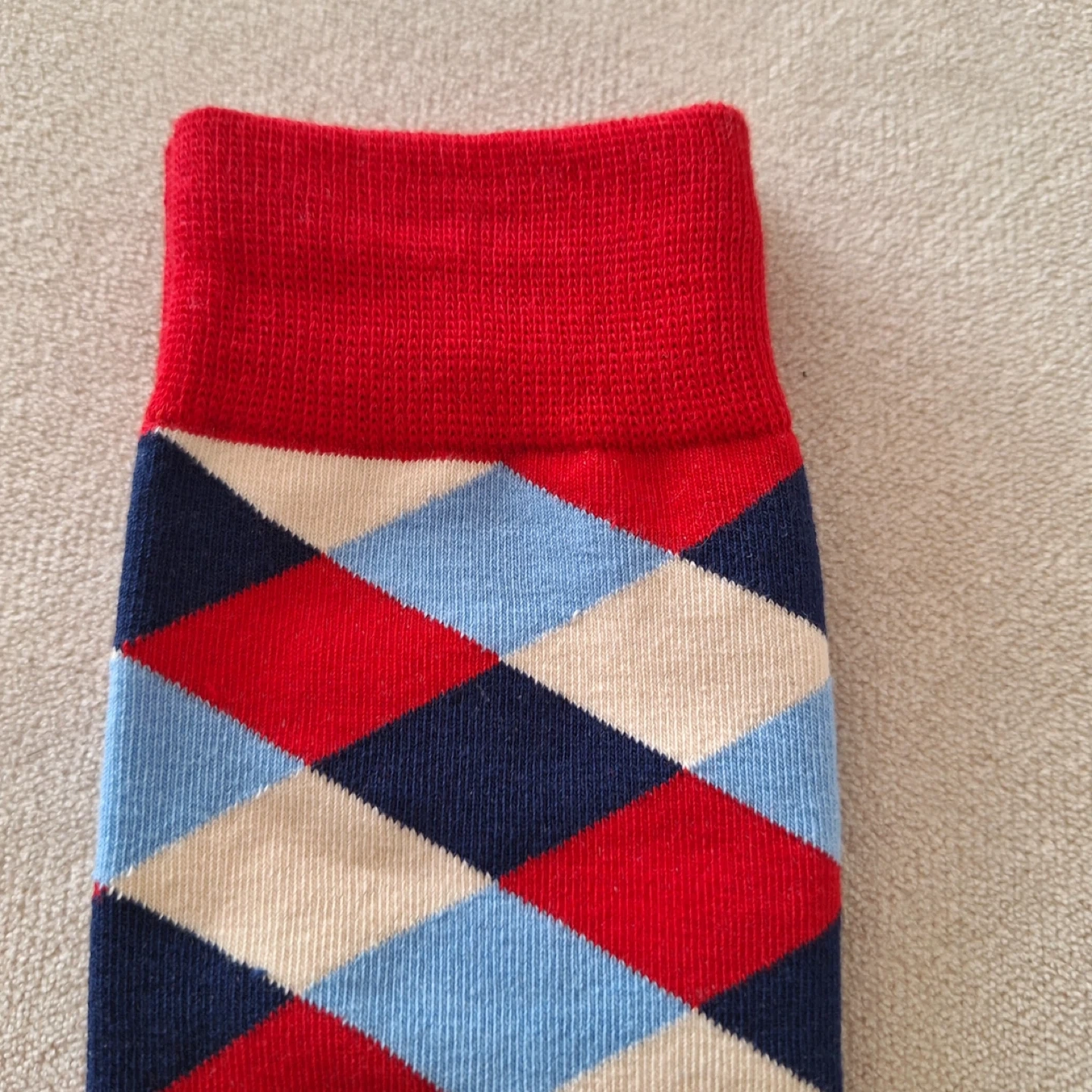 These Happy Socks feature a classic argyle pattern. They're a comfy crew sock style. Red, blue, and cream diamonds with navy and light blue stripes. Perfect for adding some flair to your everyday look! Never worn