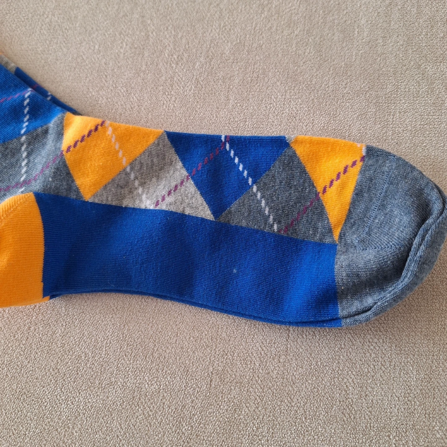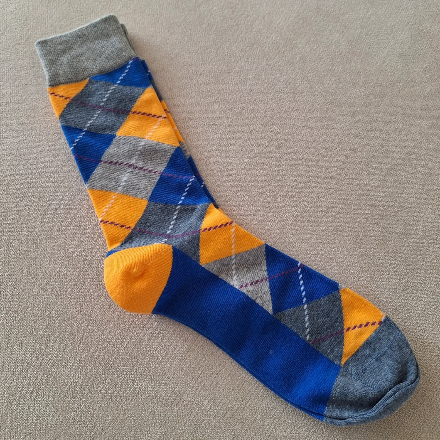 These dress socks feature a classic argyle pattern in blue, yellow, and grey. The ribbed cuff and reinforced heel and toe offer comfort and durability. They're a stylish addition to any outfit! Never worn