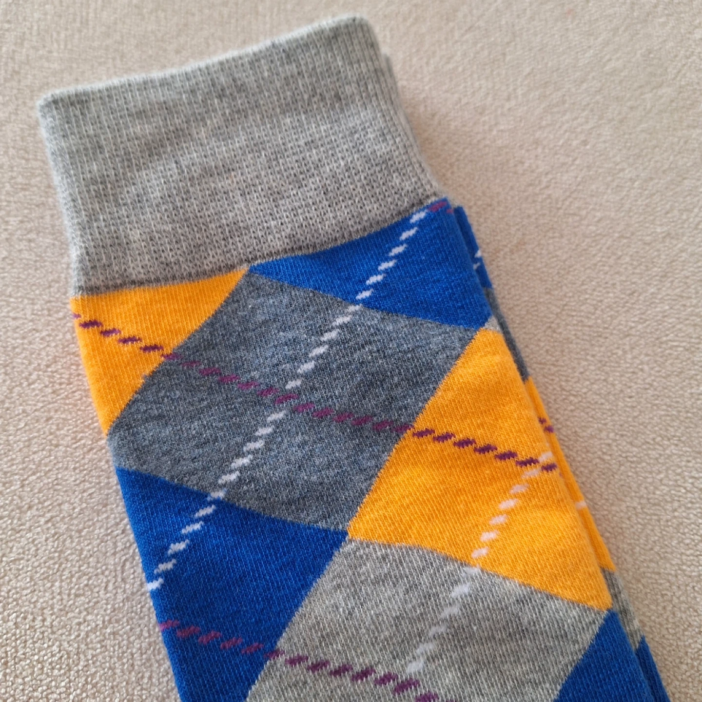 These dress socks feature a classic argyle pattern in blue, yellow, and grey. The ribbed cuff and reinforced heel and toe offer comfort and durability. They're a stylish addition to any outfit! Never worn