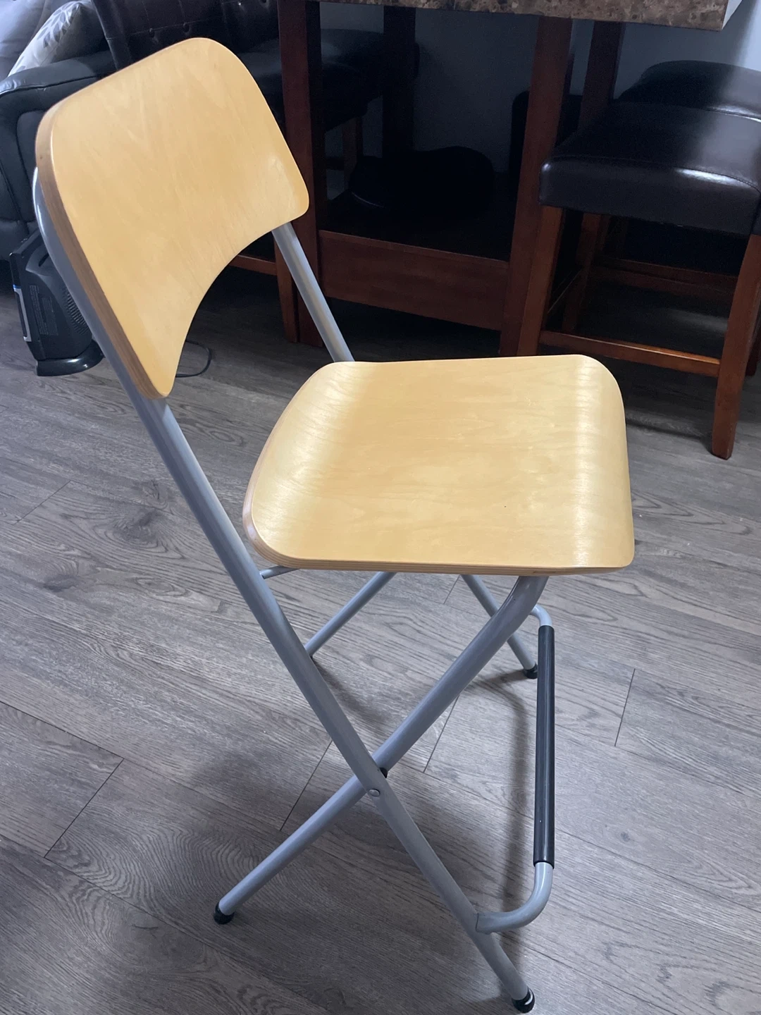 This folding chair features a light wood seat and back with a sturdy grey metal frame. It's got a footrest for added comfort. Perfect for extra seating when guests arrive!