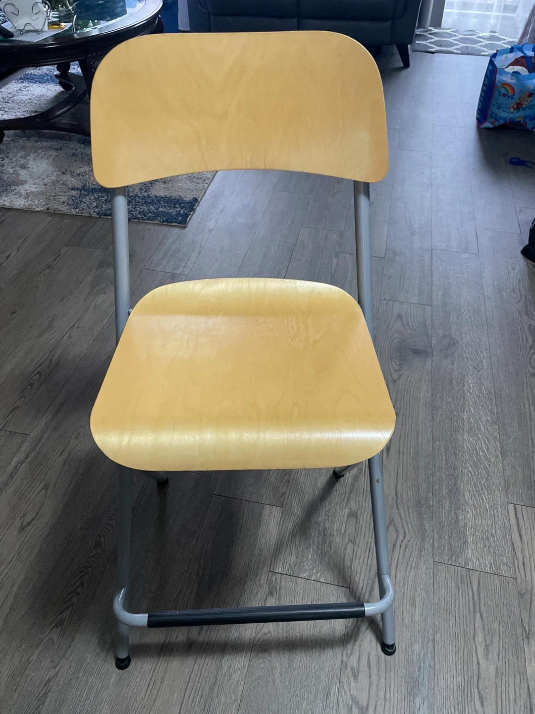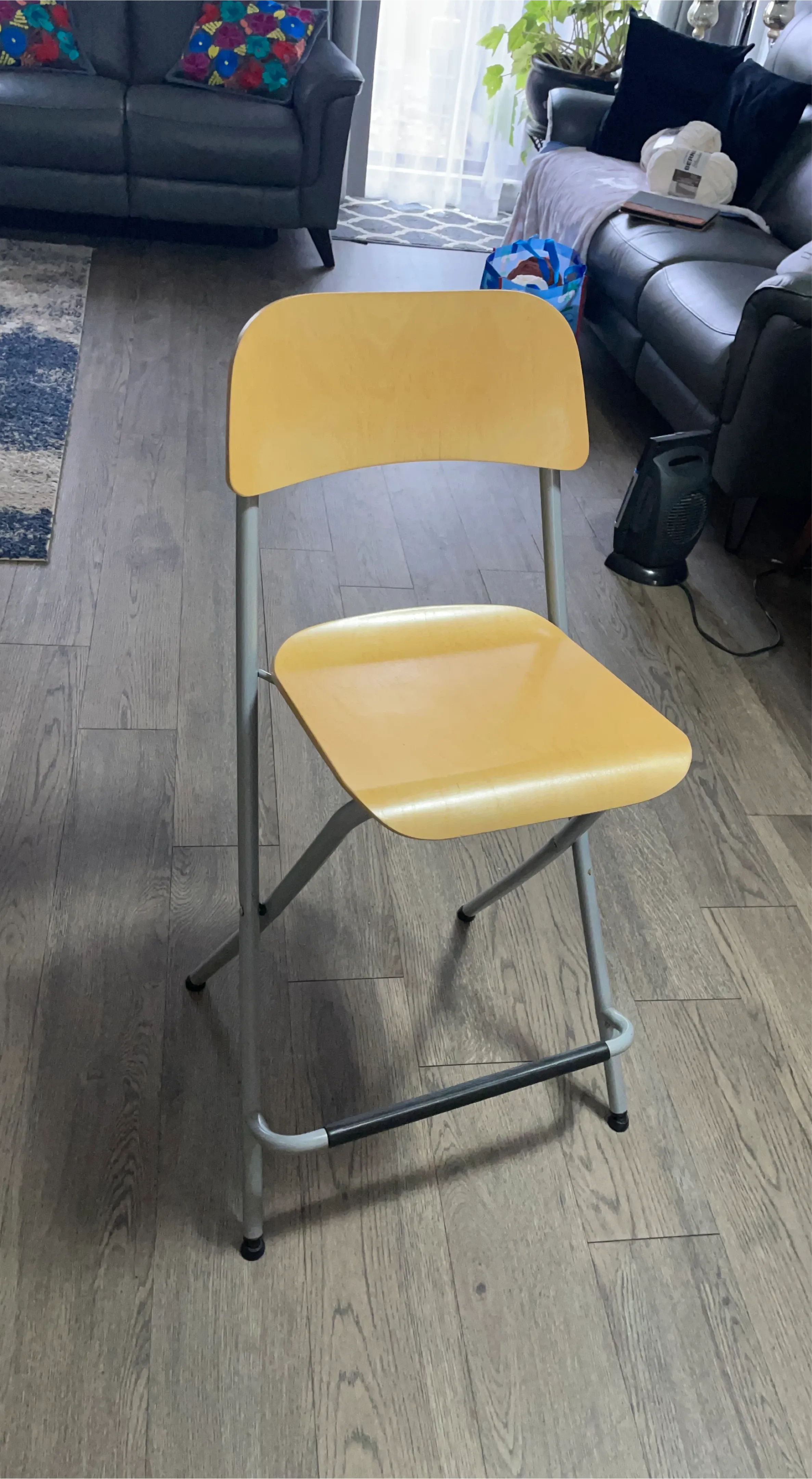 This folding chair features a light wood seat and back with a sturdy grey metal frame. It's got a footrest for added comfort. Perfect for extra seating when guests arrive!