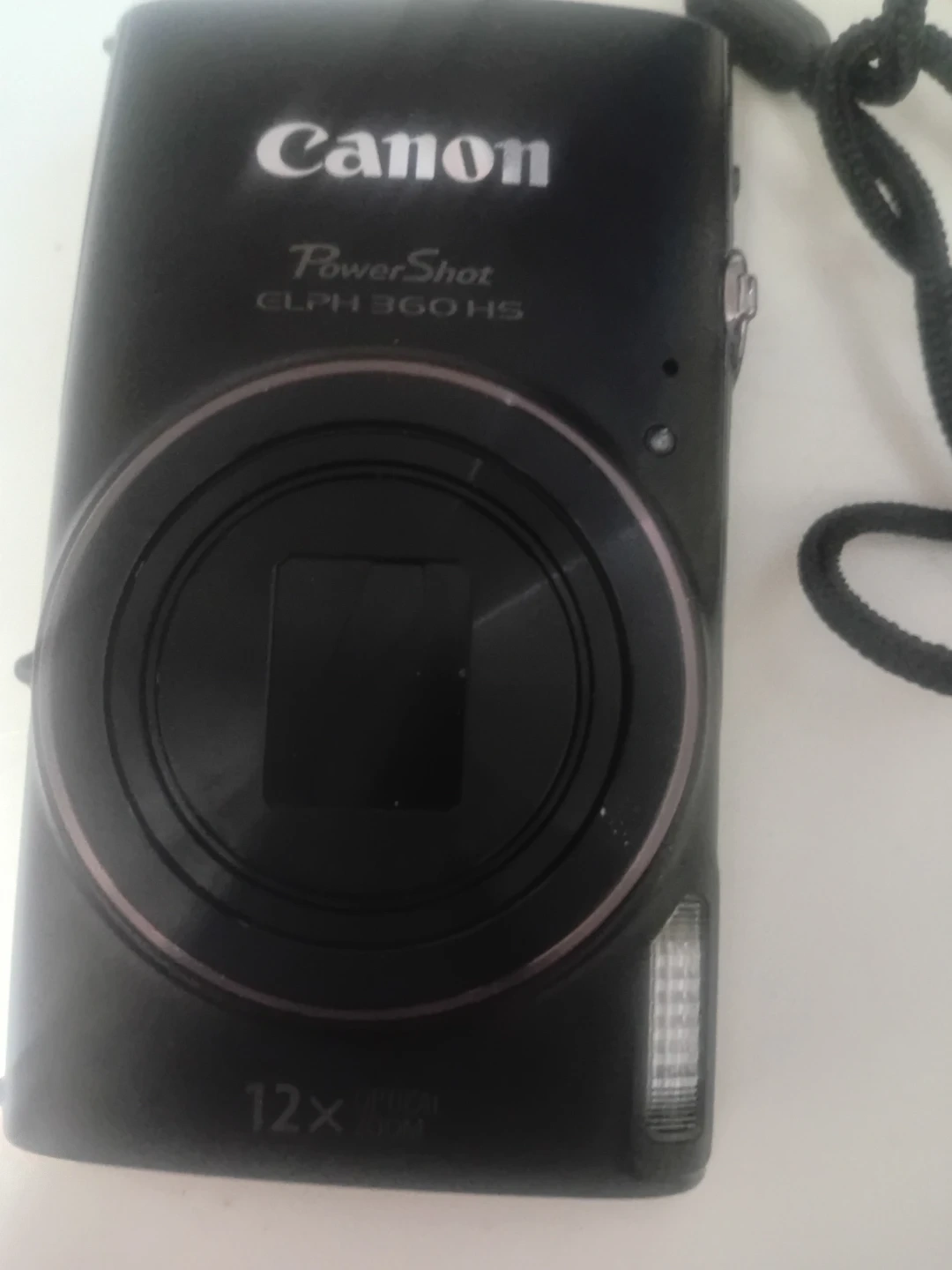 This is a black Canon PowerShot digital camera. It features 12x optical zoom. It's a compact camera, handy for everyday shots!