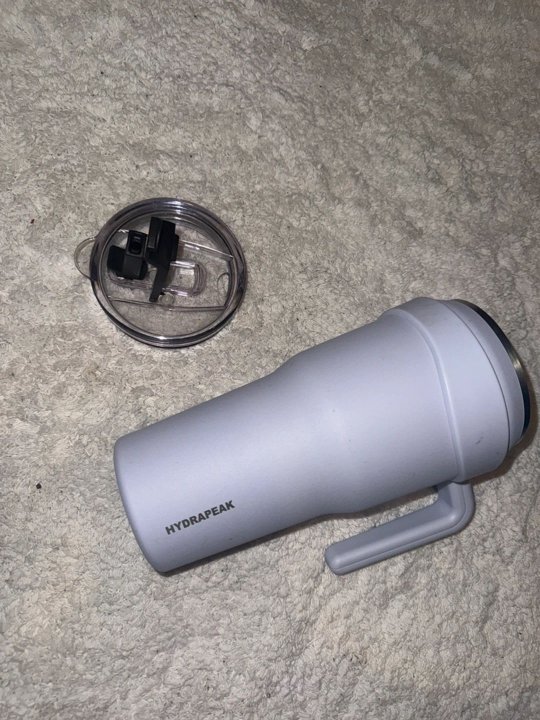This is a HYDRAPEAK tumbler with a handle and a clear lid. It's baby purple and made of stainless steel. Includes the tumbler and lid. The lid can be sip with a straw, drink y gulp