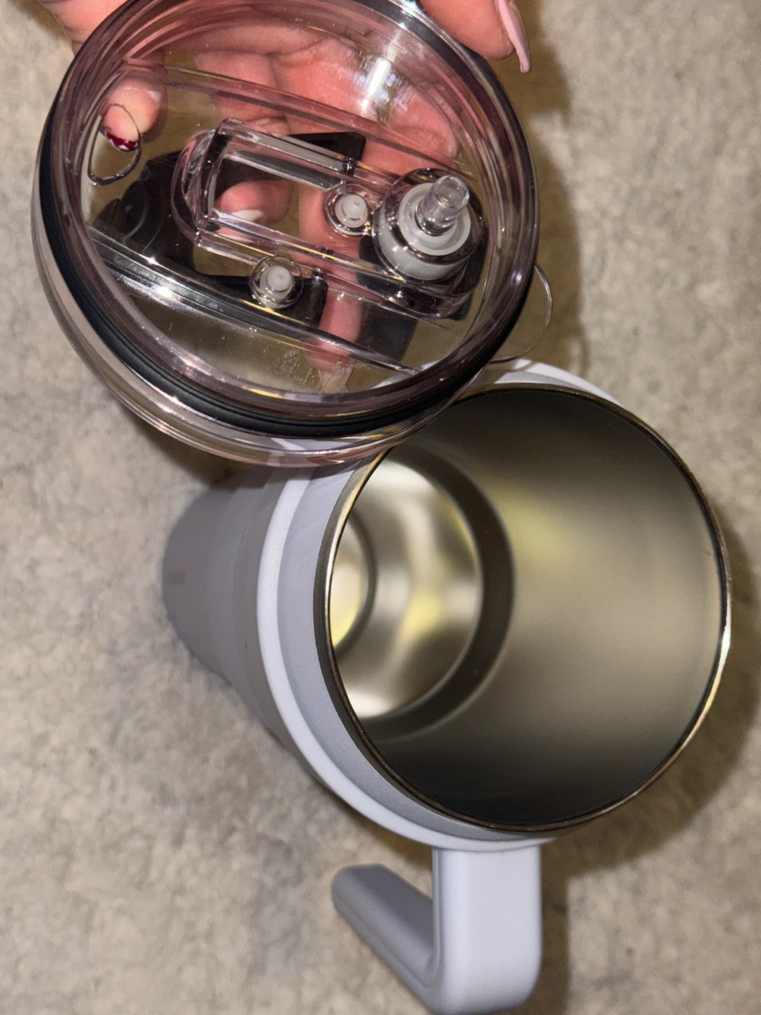 This is a HYDRAPEAK tumbler with a handle and a clear lid. It's baby purple and made of stainless steel. Includes the tumbler and lid. The lid can be sip with a straw, drink y gulp